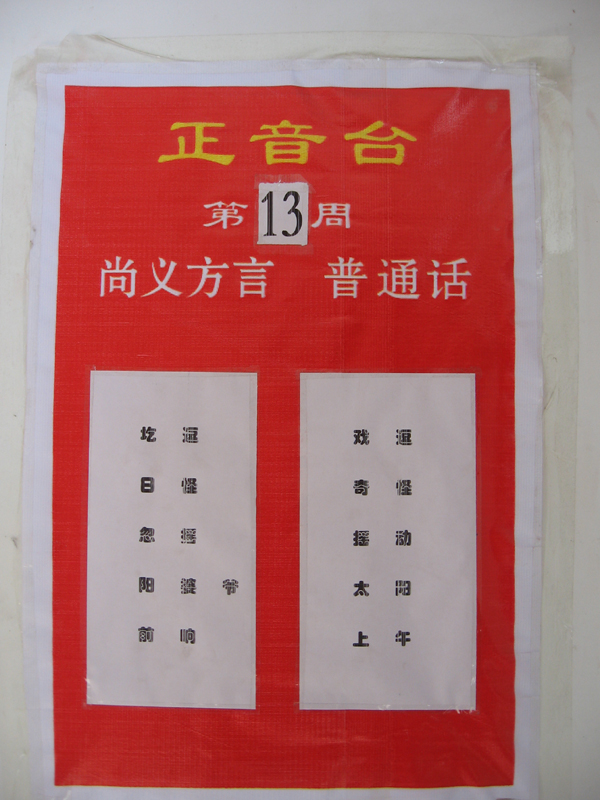 为了使全校的师生在对说普通话的认识上有一个提高,让普通话成为校园语言。我校大力营造推普的环境氛围。学校以推普为主题以班为单位出了走廊墙报、黑板报,张贴了宣传画,还独具心裁的在教学楼的门口挂了地方方言与普通话的对照词表,每天更新。
