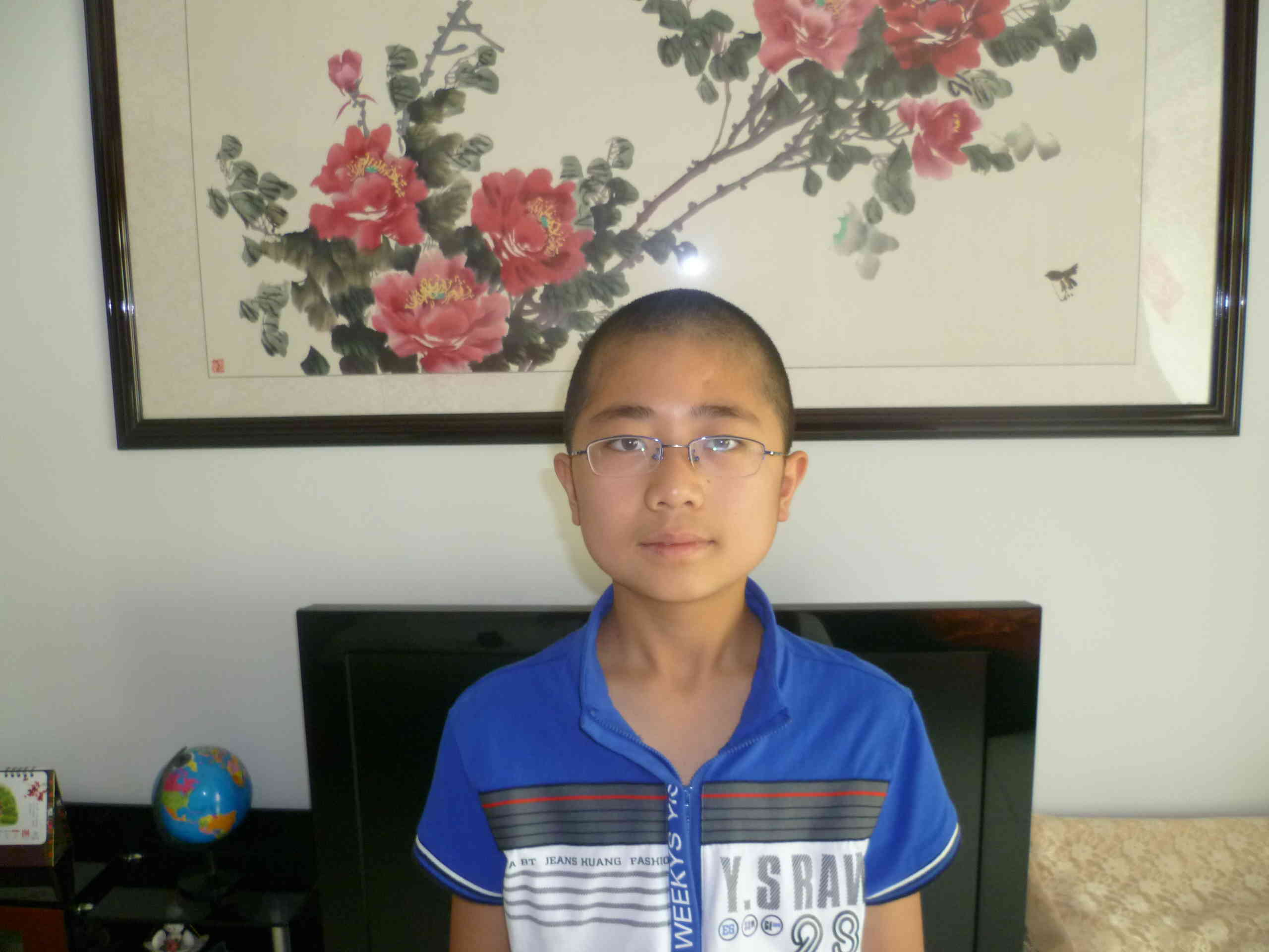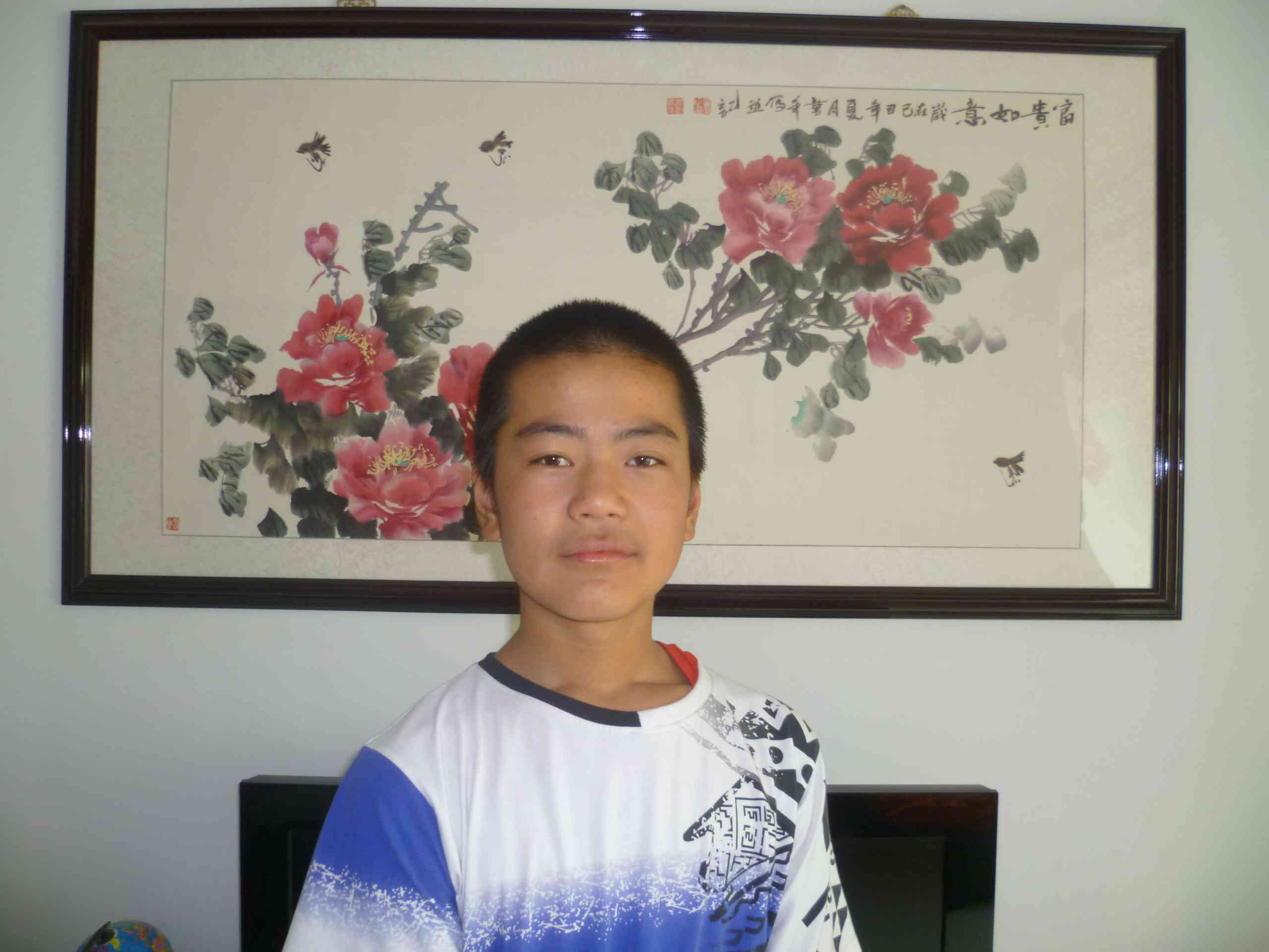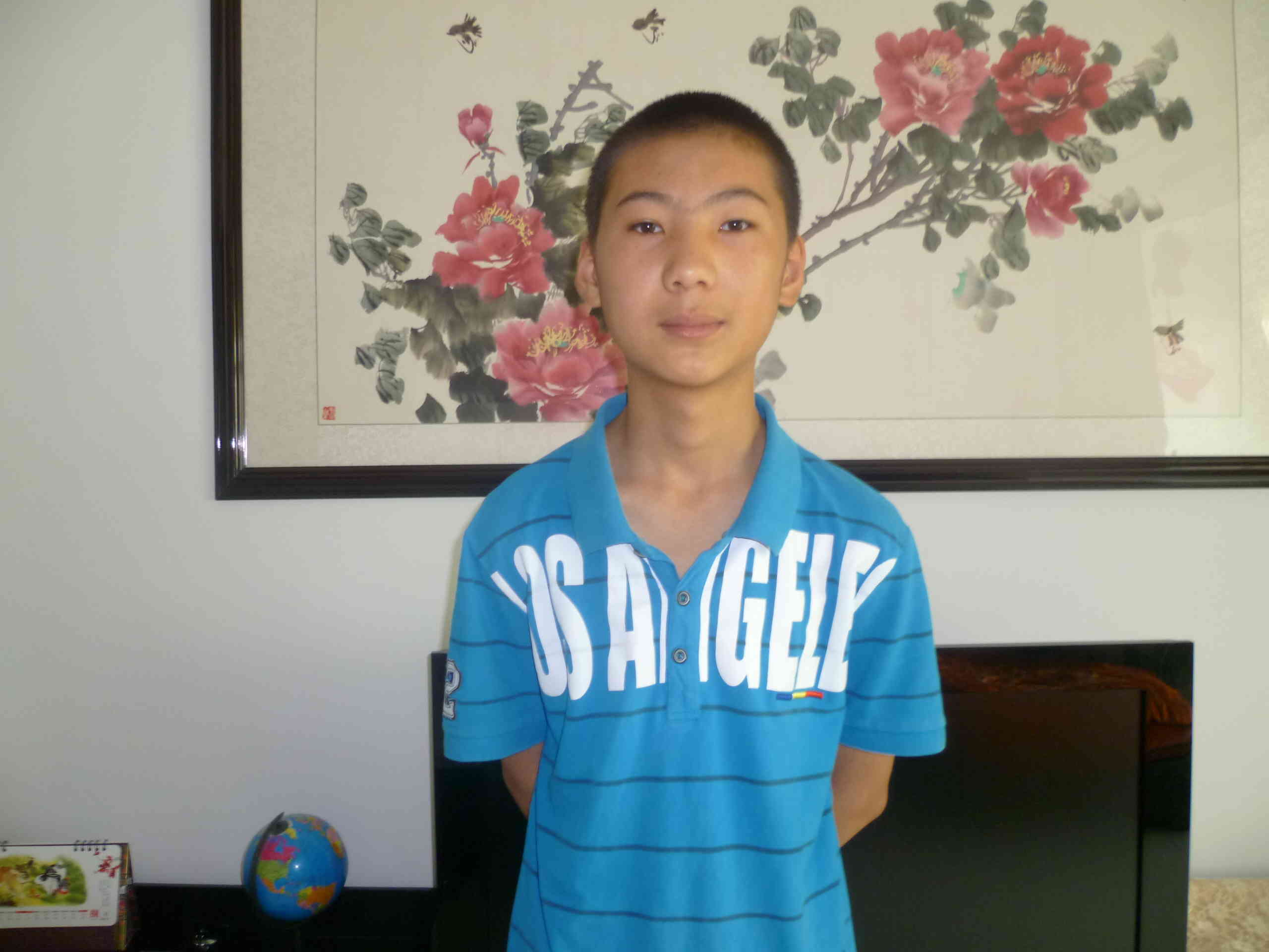 先说说壮壮虎樊中文吧。他,中等个子,大眼睛,嘴巴一咧可以咧到天上去。他最喜欢唱歌、画画。什么流行歌曲、什么儿歌、什么红歌,无有不会;漫画是他的长项,他的卧室的房间里有许多他的得意之作。我总是羡慕他的一幅好嗓子。壮壮虎------一个有着艺术细胞、有时耍耍小孩子脾气、阳光的男生!