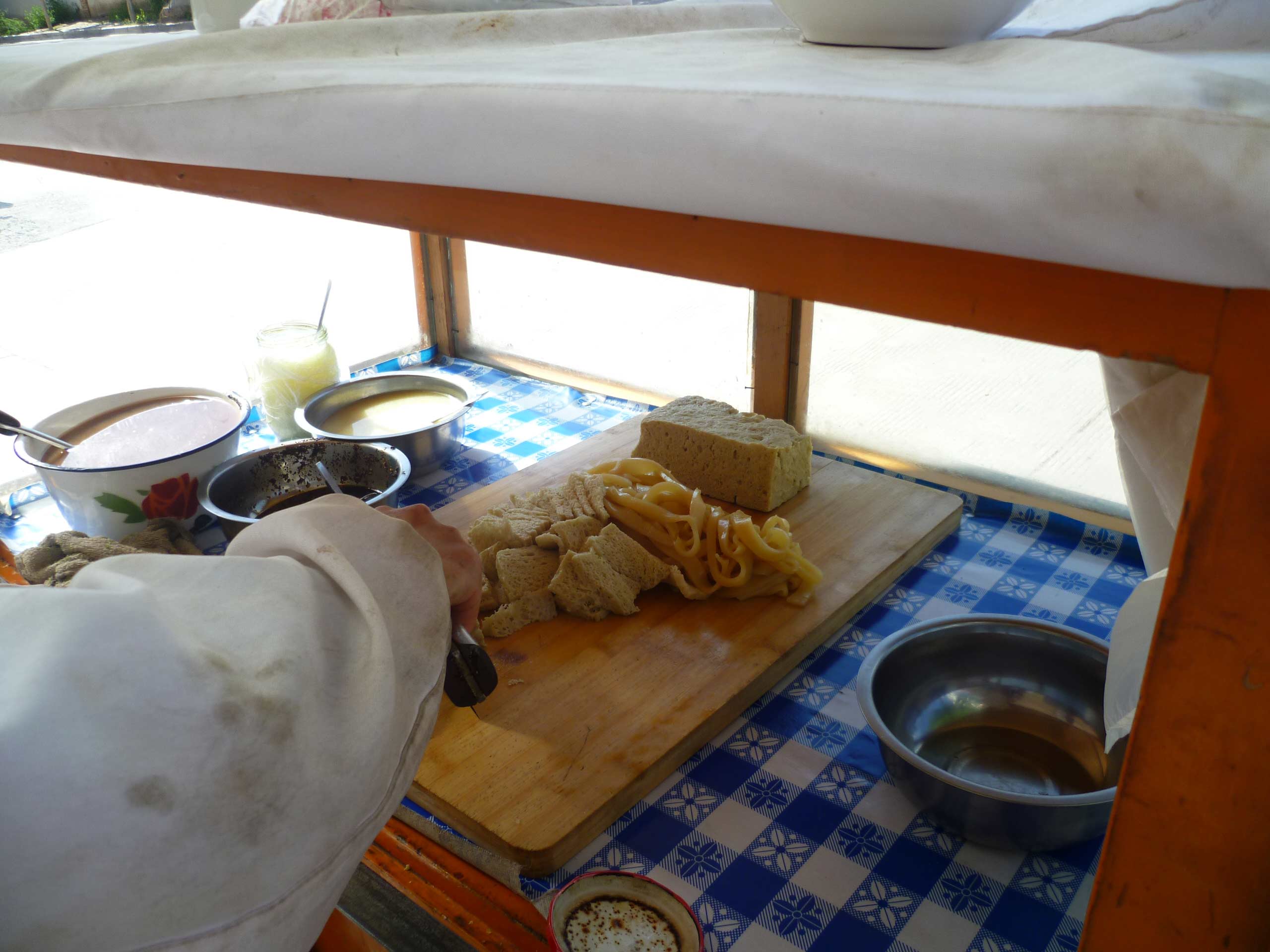再有一种美食,美其名曰干拌。先用优质面粉掺水后使劲揉成团,然后用擀杖压成扁圆形,再擀成一张大大圆圆的面张,期间不时撒些面粉。要注意和面时不宜过软亦不宜过硬,必须恰到好处,否则擀面时面太软会烂,而太硬又擀不开,因此适宜最好。擀好后先放一放,再调些西红柿鸡蛋汤。接着切成面条,下入锅中,煮熟出锅,调上汤,即成为一碗美食。