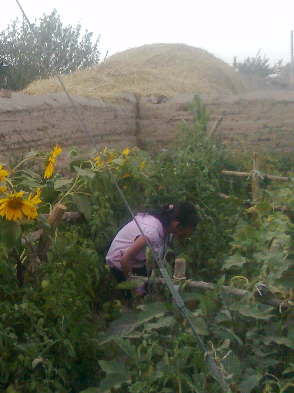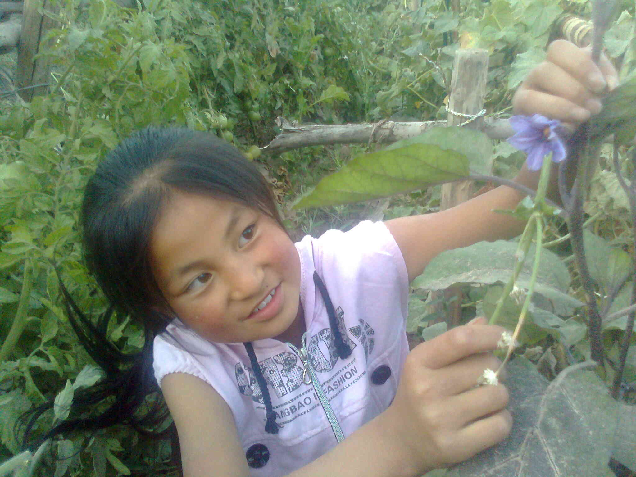 因为这里很少有蜜蜂来,所以她才决定人工传粉。她在产粉的花上摘下花粉,然后,再将它放在茄子花的花中间,用木棒往里一放,就传上粉了。她的动作是那么井然有序,她微笑着,以为成功将会来临。由此可见,这个小女孩在家中常帮家人做些家务事。在传粉完毕时,花儿朝她微笑,仿佛再说:"谢谢你小朋友."