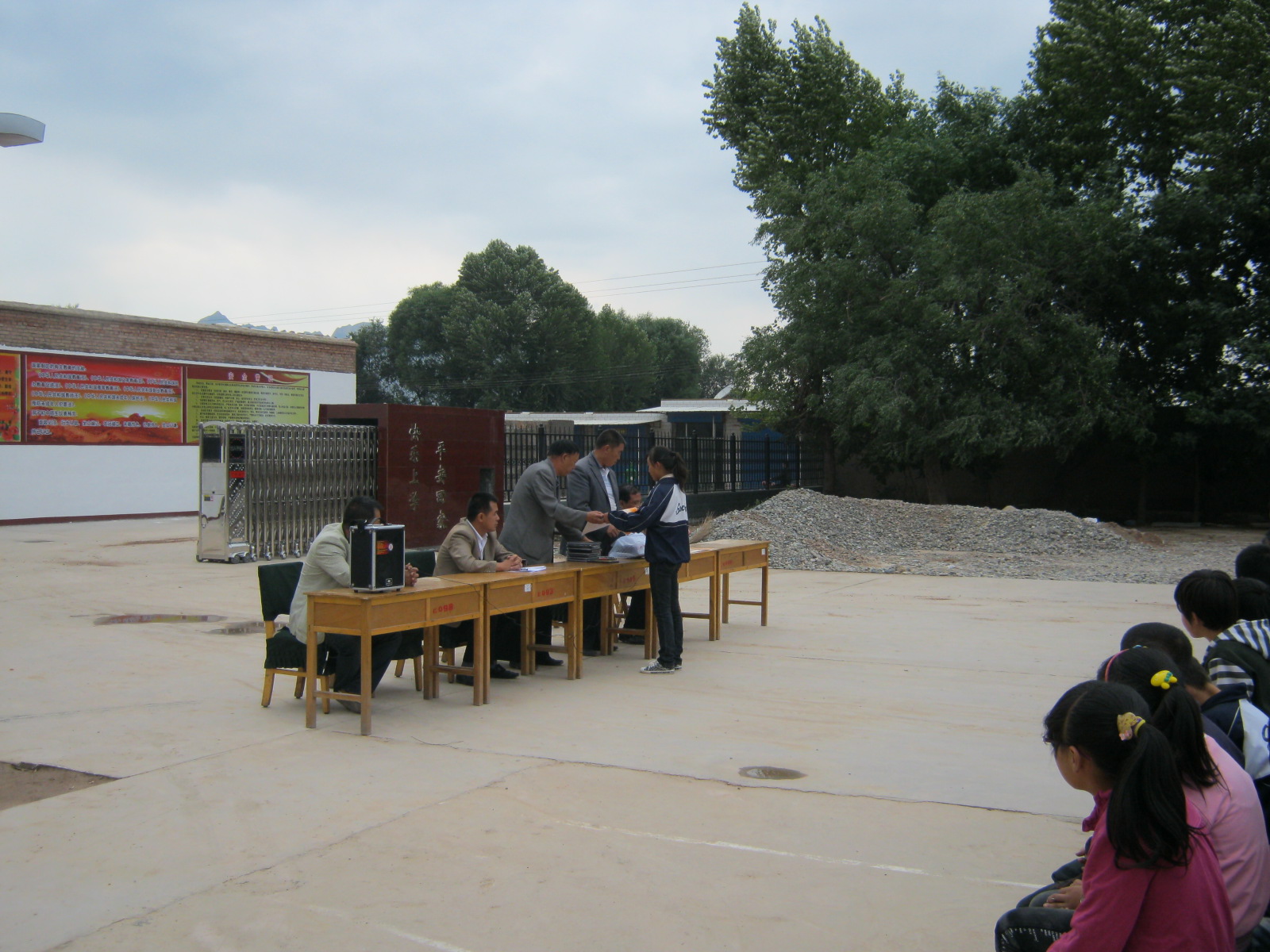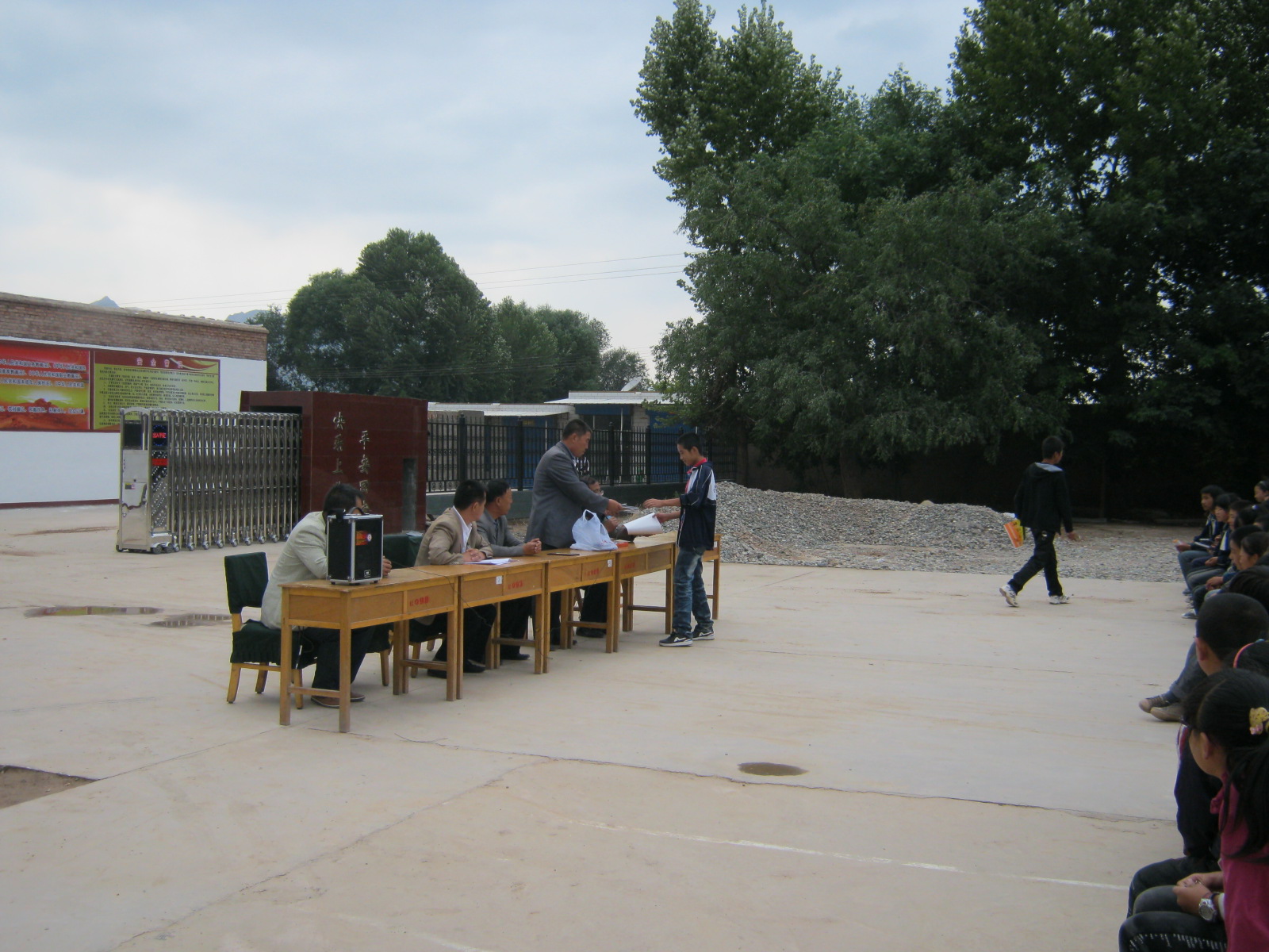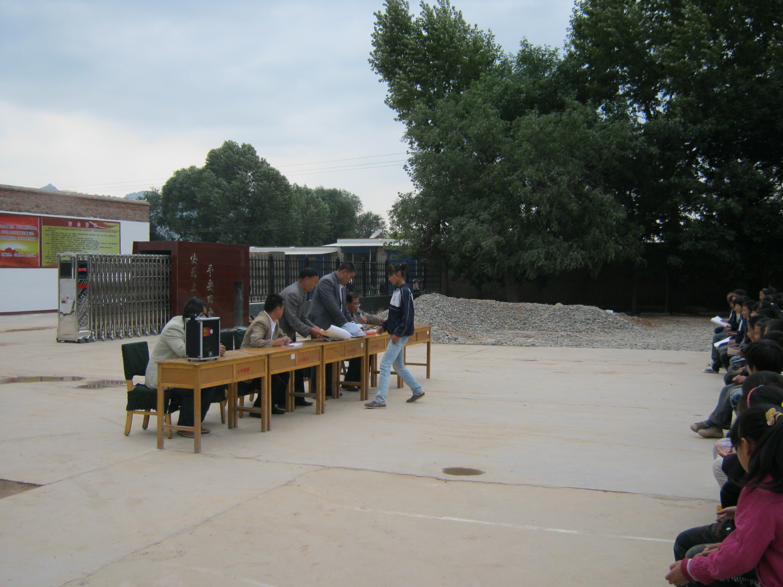今天下午学校召开了开学典礼,下午第二节课刚下,班主任就让我们带着凳子来到了操场,我们坐到了新校门的前面。