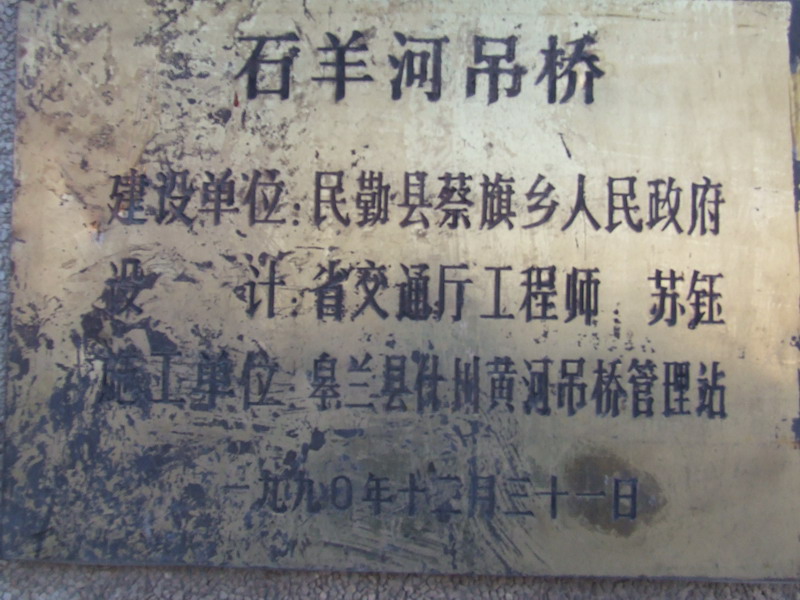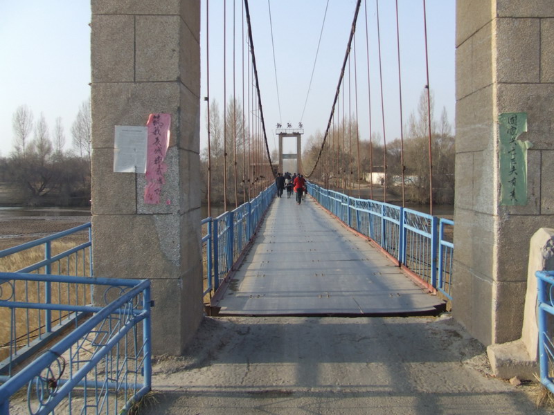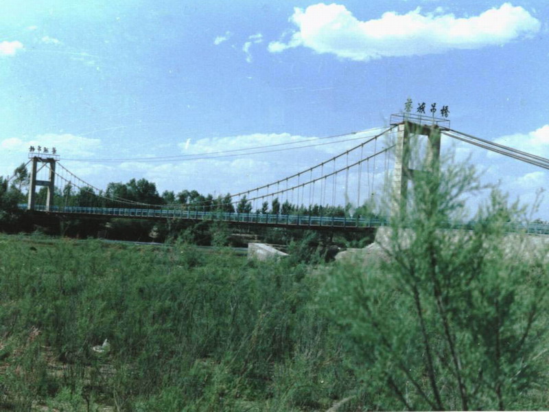 吊桥,顾名思义是一座凭借外力吊起来的桥,远远望去就像一条悬在空中的灰龙。桥身长约60米,宽2米。走近细看,你会发现它是一座钢索铁臂的人行桥。你看,离石羊河两岸约十几米的地方左右均有两个固定的铁匣子,从里面各伸出四根腕粗的钢绳,弯成新月状横跨两个桥墩,再从钢绳下悬拇指般粗细的钢筋用来固定桥身。吊桥桥面铺的是约1公分厚的钢板,很平整,两边还加上了防护拦,人走在上面嗡嗡有声,仅仅有一丝轻微的晃动。