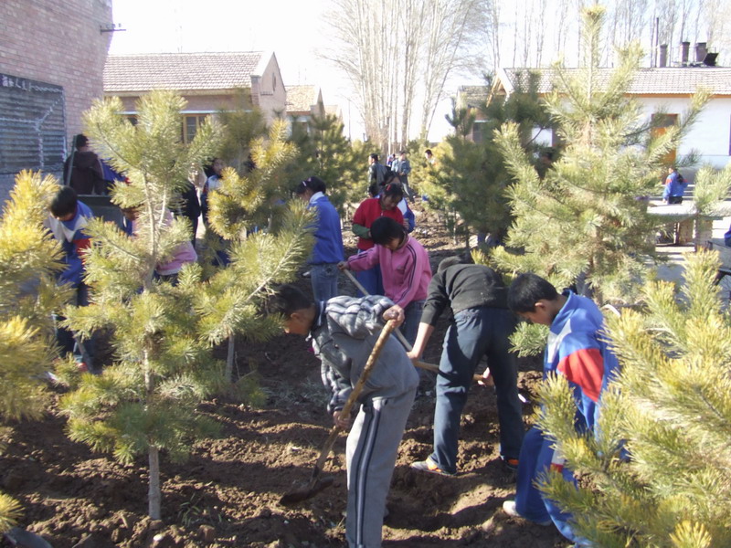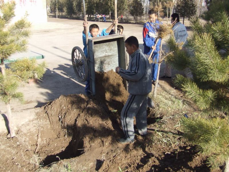 冬天到了,为了让学校的那些常青树能够长得更旺盛,星期四的下午,学校组织七年级的同学给常青树增加"营养 "。 下午1点左右,同学们就开始行动了。在班主任的安排下,同学们在树边挖坑的挖坑,拉苦豆秧(一种植物可以作为肥料使用)的拉苦豆秧,拉粪的拉粪。同学们各司其职,干得异常认真。