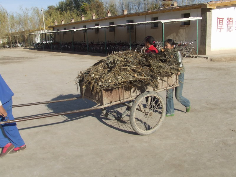苦豆秧很轻,于是就由几个女同学去拉,她们也干得非常认真,能按时将苦豆秧运送过来。 拉粪的自然是男同学了,你看,那几个男同学又拉来了一车粪,正在往挖好的坑里面倒呢。