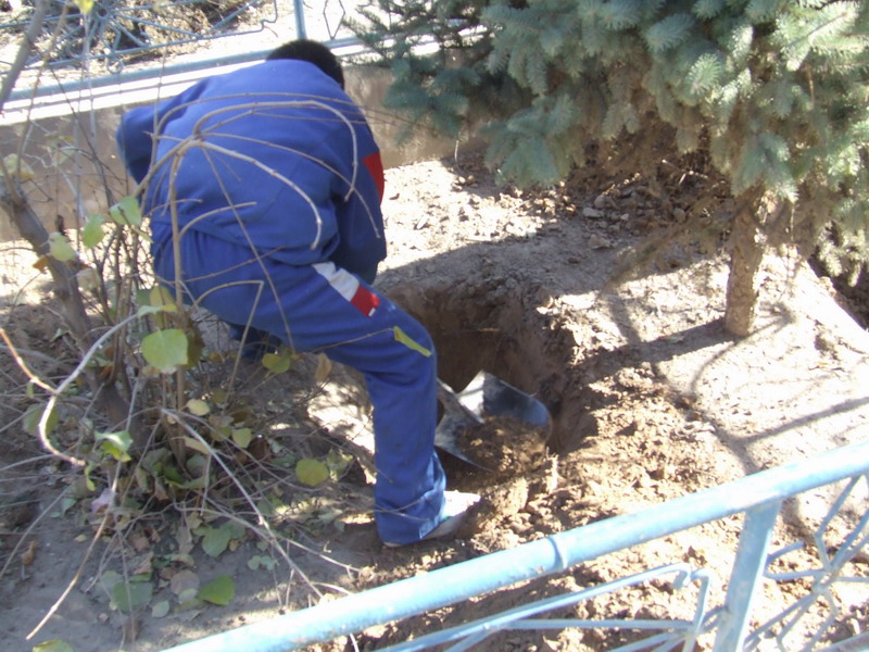 你可不要觉得挖坑是个轻松的活,因为在护拦里面挖坑,不能靠树太近,地方又小,再加上那里面的地也有一定的硬度,所以挖起来有困难,于是同学们就轮流挖,正所谓"众人拾柴火焰高",经过一段时间的努力,坑终于挖好了。