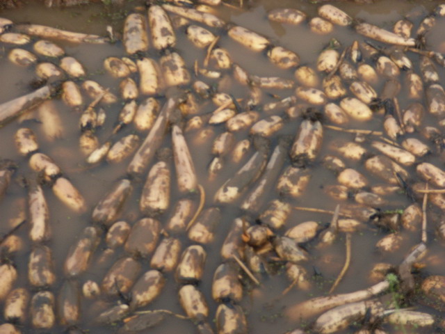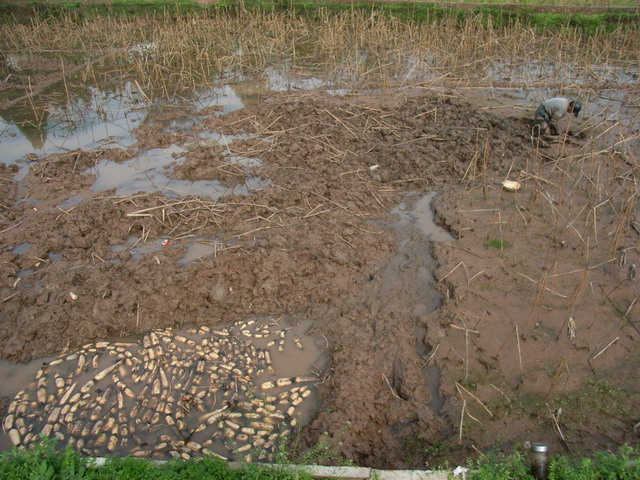 把藕挖出来了,一个个都被泥裹住了,这位伯伯还要用清水把它们洗干净,再拉到市场上去卖。这位农民伯伯说,今年的藕就卖完了,池塘再整理一下除除草,明年还要继续种藕。