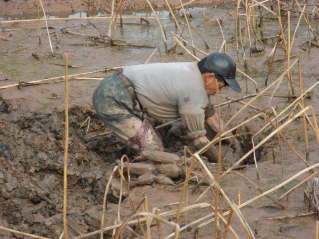 冬天非常冷,这位伯伯还是光着脚下去挖藕,只有几度的温度,可想而知有多冷,虽然非常辛苦但种了一年的藕,收入也非常不错,拿去城里卖可以卖到2块钱一斤,而且非常畅销,因为是自己种的,属绿色食品。