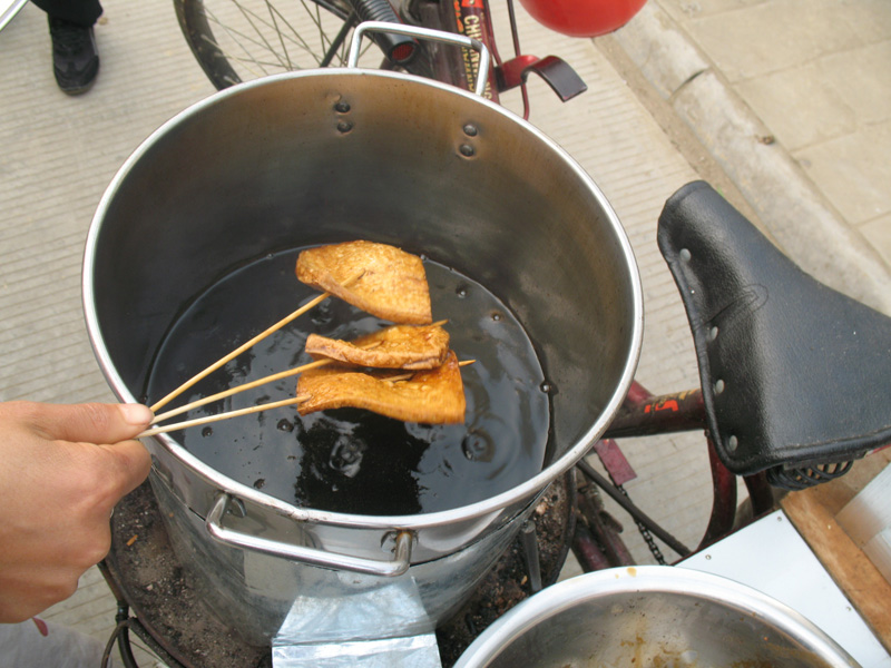 如果你要想听,就叫小老板现做。做法也简单,就是下油锅。选好要吃的数量,下油锅,一分钟后起锅,就行了,接下来就是放调料调味。