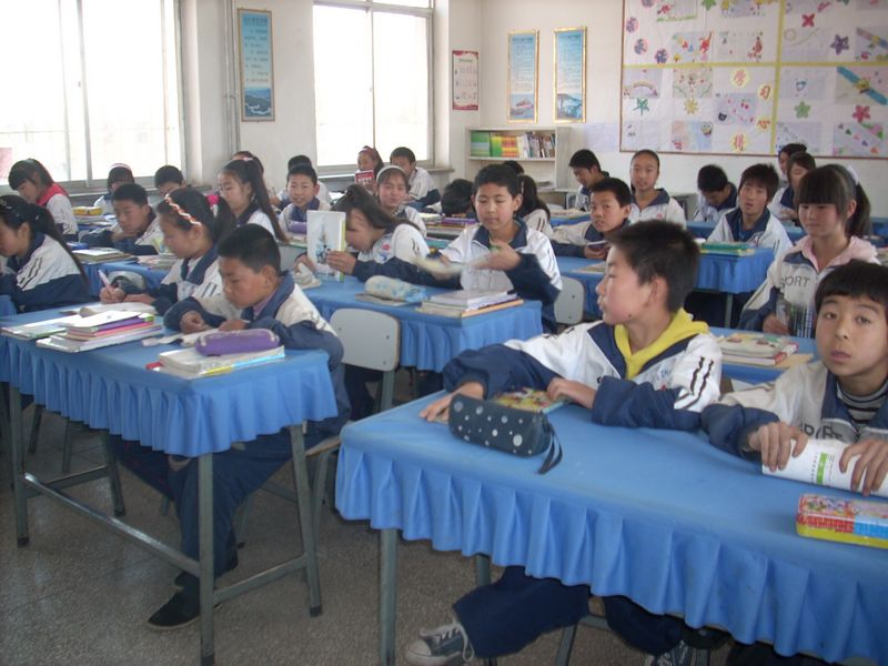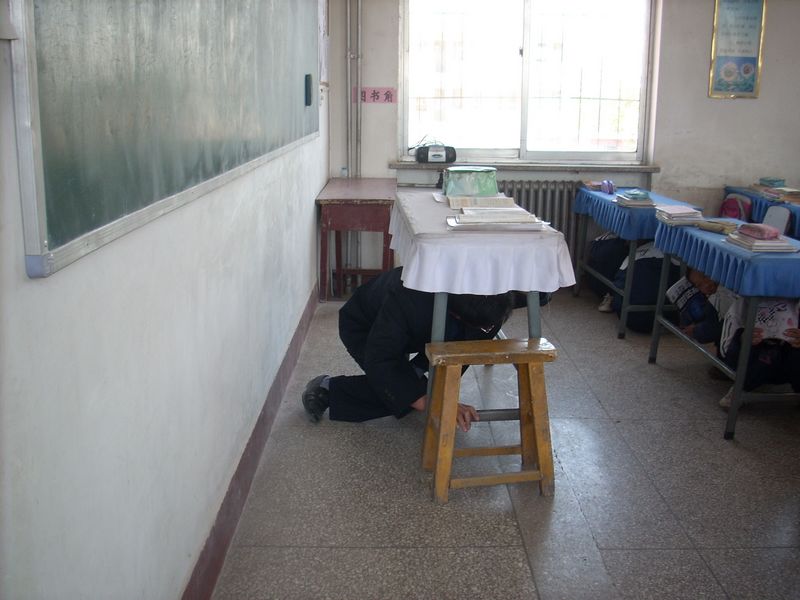 教室里的老师、学生还没有来得及问清原因,立即趴在了桌子底下,看,我们的老师也和学生一样躲藏到了桌子底下了。教室里的防地震演练在班长的组织下效果很好。