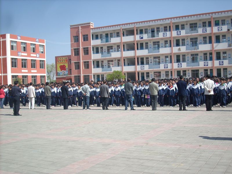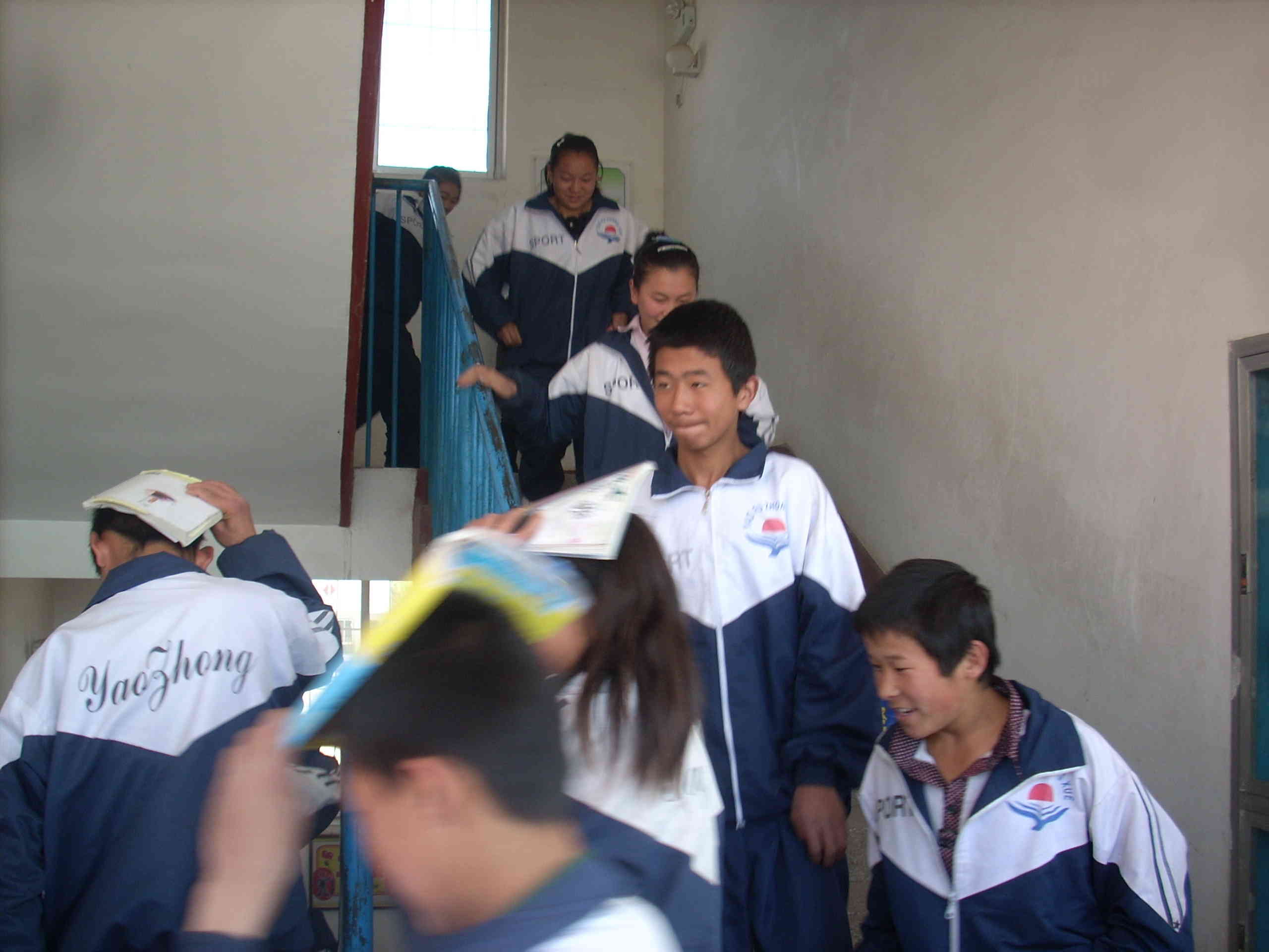 当"呜呜"的广播声停止后,班长又发出口令:"大家双手抱头,按组依次撤离教室"。这样,学生开始有序的离开教室,向操场走去,下楼梯时,还有不少学生用书本盖着头,以做到"安全第一"。在每个楼梯口,还有中层领导在指挥学生撤离。