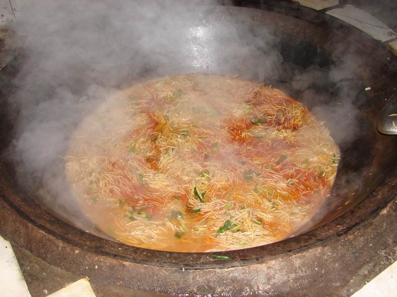 呵呵,锅里正炒着醋溜土豆丝,色彩挺诱人的,香醋味阵阵飘起,真的能勾起人的食欲来.来察人员一边点着头一边给出了忠恳建议:适当再调些绿色菜,有条件的话加些鸡蛋就会更有营养了.