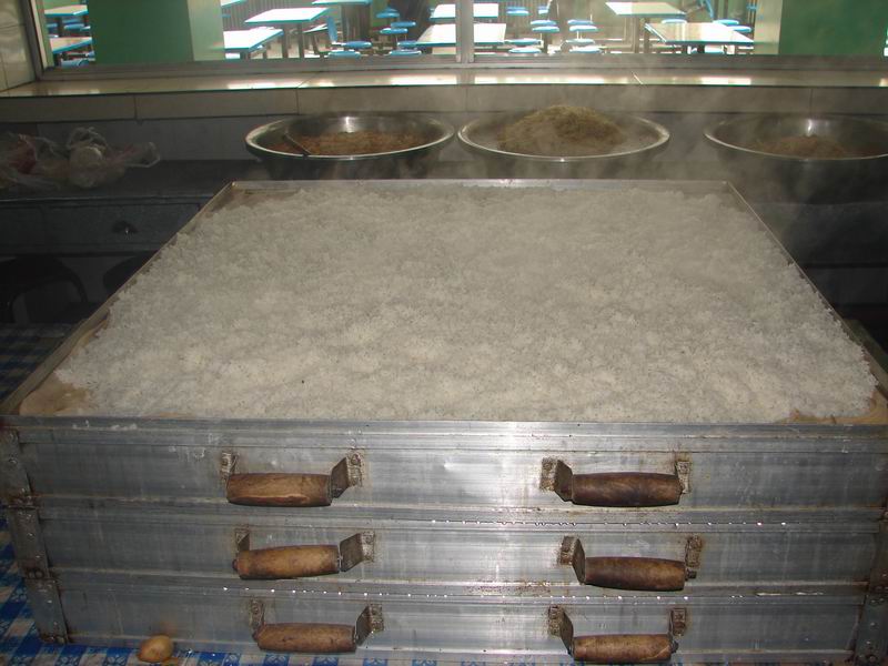 看着刚出笼的白花花米饭,检查人员叮嘱老板说,今年秋收时雨水多,造成水稻有发霉现象,一定要杜绝给学生食用发霉的米做的米饭,否则造成不良后果一定严惩.