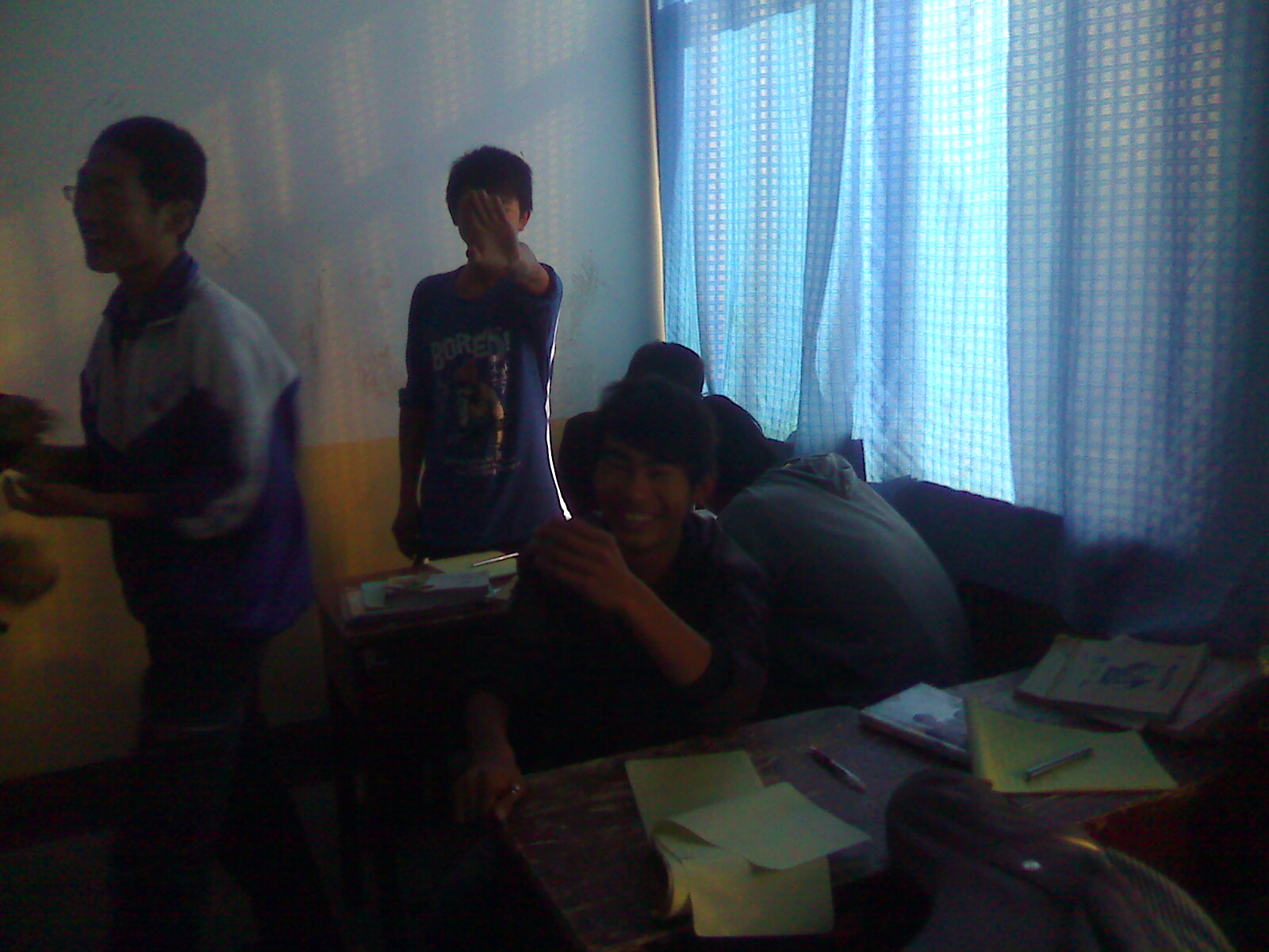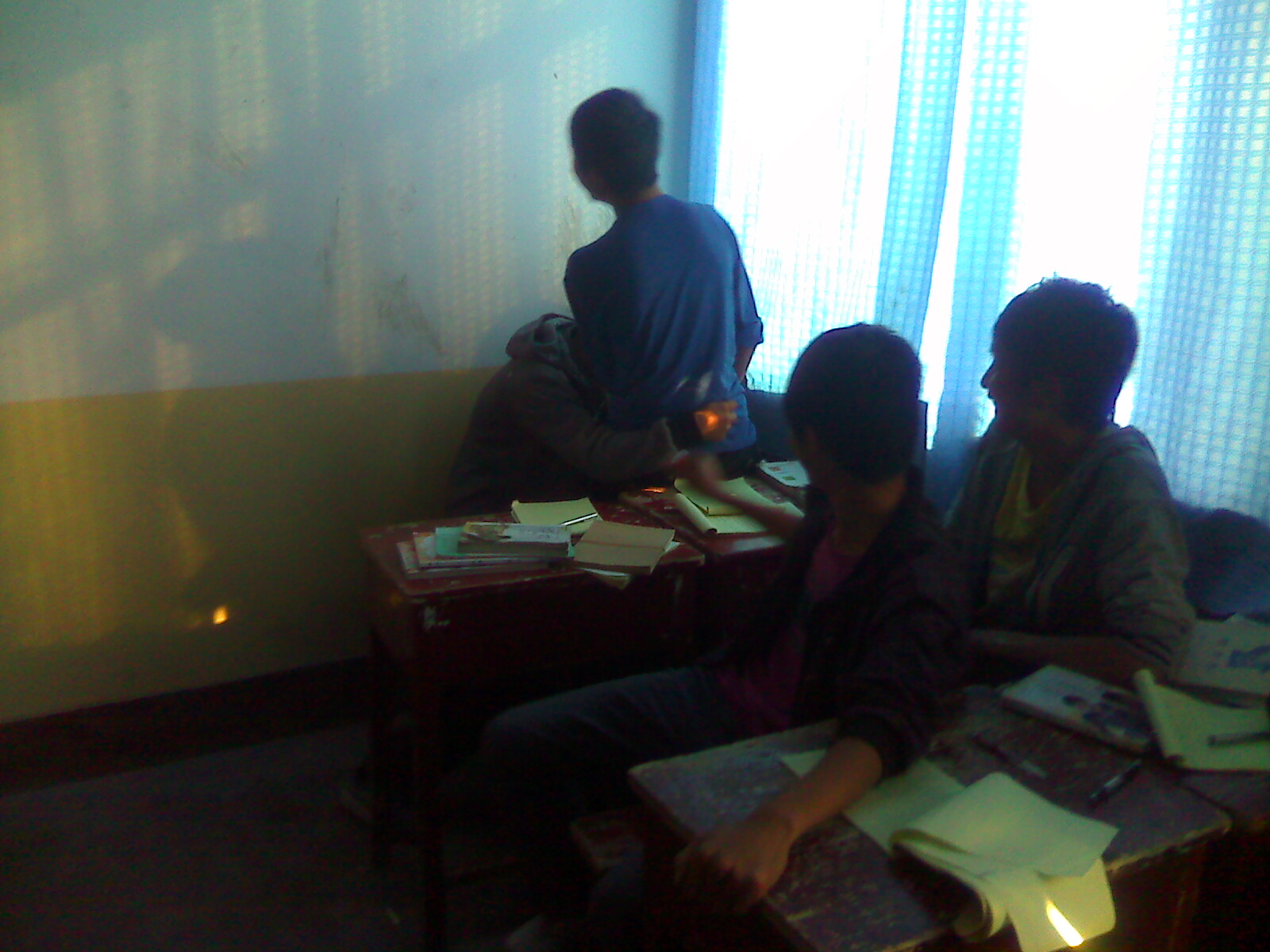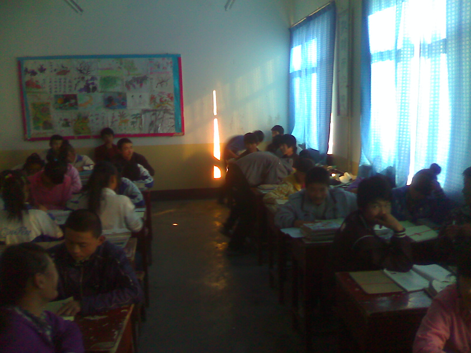 "吱——,幽门脆响,风从楼道内的窗外进来,连闪带躲的避开了这个人,狠狠地吹起前排桌子的纸屑儿,片儿,书叶儿,顿生茫茫一片。我们呆若木鸡,尤其徐世天,嘴大张着,下巴都快着地了。"怎么了"?不知是谁一声失惊大叫,破了此阵。 "我认识一下是谁嘴唇震动频率最高。我们互相思量着。眼睛里射出乞求的目光,祈望"大人"宽恕了我们这些人的也许有几道射进了他的眼睛中:不多时,他便走了。我们长吁短叹,自我安慰;总算是躲过此劫。
