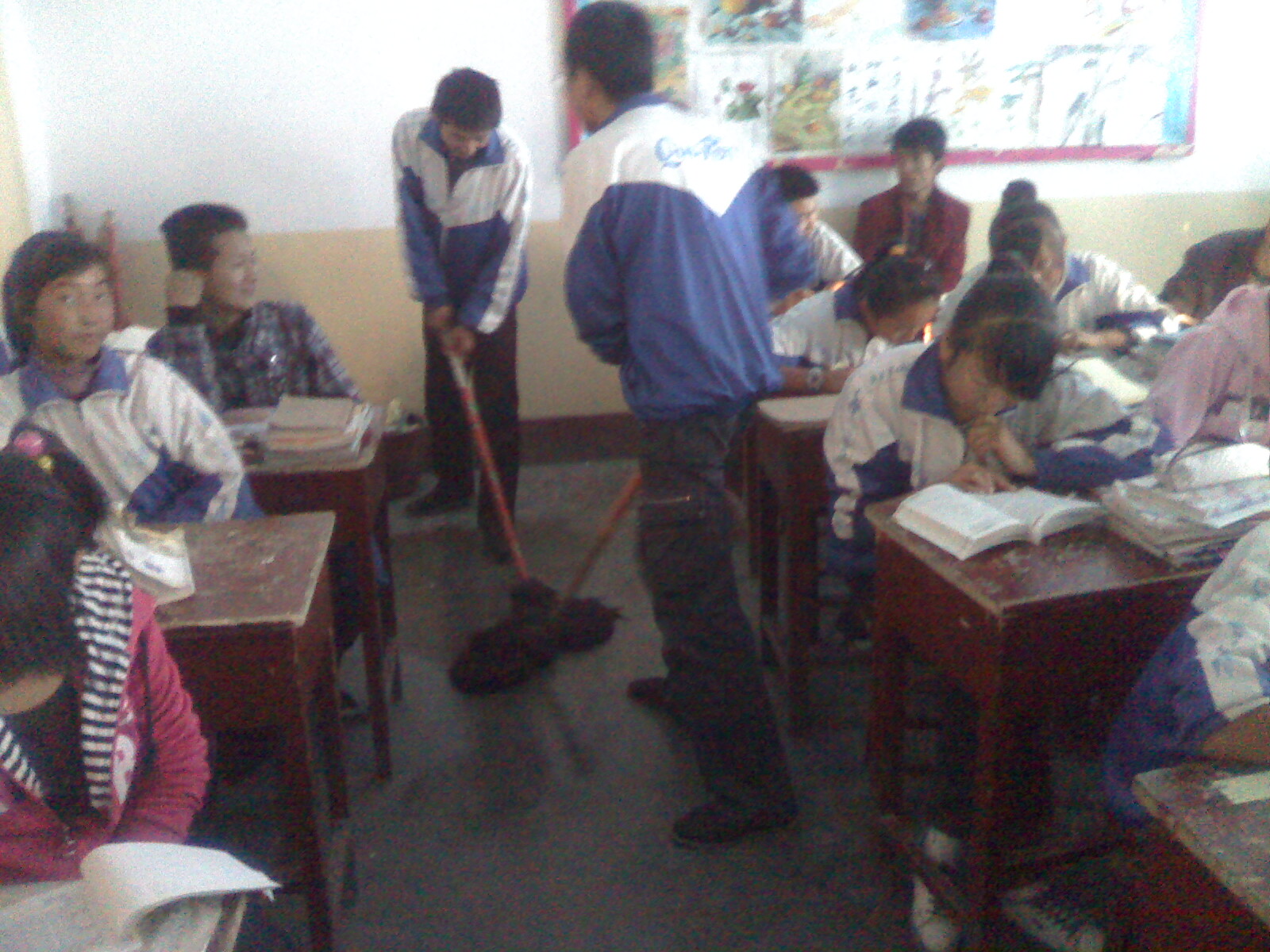 "喂,中午来赶紧打扫四楼卫生,领导马上来了。"卫生委员有责任心但很苦闷地说。