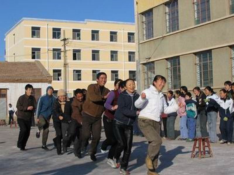 第一个比赛是三人绑腿比赛,作这个游戏一点也不难,只要有两根绳子就行了。这个游戏主要是考察老师们的协作能力,看老师们的协作能力还是相当强的,他们配合的多好呀!