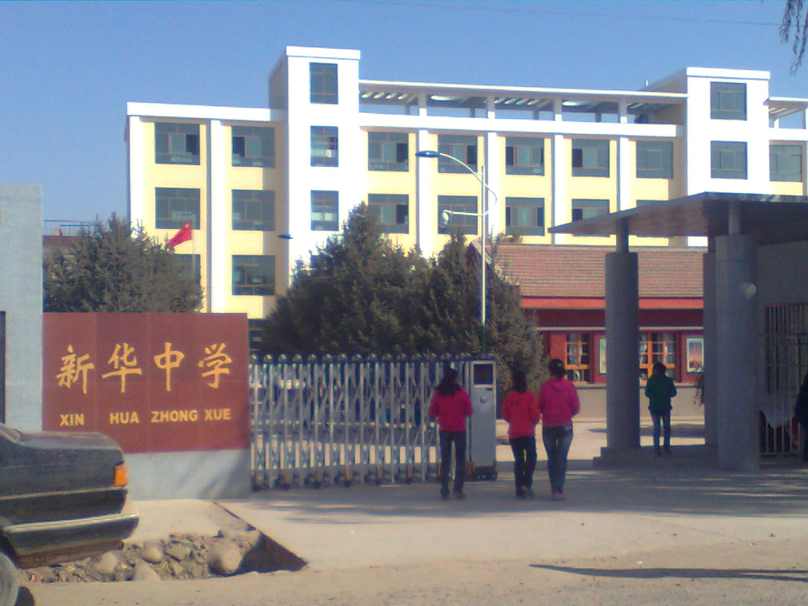 站在校门口首先映入眼帘的是泛着金光的四个大字"新华中学"和漂亮的电动校门;走进校门有几颗坚韧不拔的松树屹立在一条宽敞的马路两旁,一面鲜艳的五星红旗在教学楼前随风飘扬。