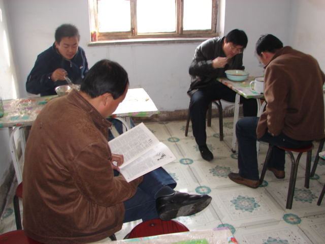 开饭了,身上、手上还沾着粉笔灰的老师们排队各自打好了饭找个座位坐下来开吃了。当然了,下雨天的话还得防着屋顶掉下的白灰皮或水珠别落到碗里,若真落上的话,那就权当是免费补钙了。
