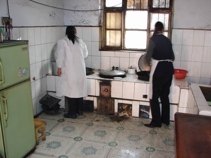 天麻麻亮,做饭的两位师傅就得爬起来上锅了。一天三餐,早餐或汤面条或稀饭就馒头,中餐米饭,晚餐稠面条。月薪400元,在这个物价飞涨的年代,这点儿薪水怕也就能养活一个人而已了。旁边的冰箱是摆设,早坏了,不致冷,扔掉可惜,还能放一些餐具的。