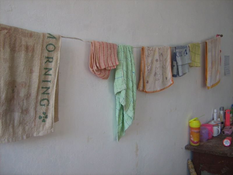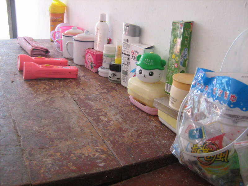 她们的洗梳用品,在一张桌子上或柜子上放着,是那么的简朴,不过他们却不在乎这个,只要把用品都放整齐就可以了,他们主要任务是学习。