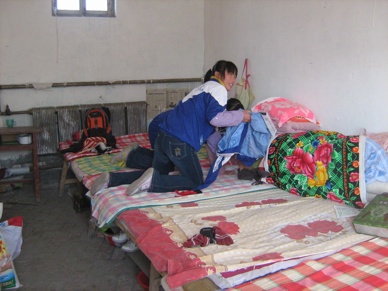 在吃饭时,她们把饭打来,就坐在床板上吃,几个人在一起坐在吃饭,感到无比的高兴与自豪,因为他们已经很满足了有这样学校为他们安排,真的很好了。