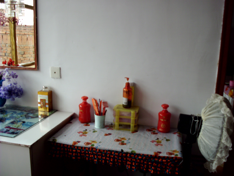 这是我的梳妆台,虽然是由缝纫机"冒充"的,但我浑然不觉,倍加喜欢。早晨起来,精神振作,站在它的面前对镜梳妆,旁边有花的陪伴。闻着花香,不由得就陶醉了,觉得自己就是一朵花,一朵还未绽放的花。