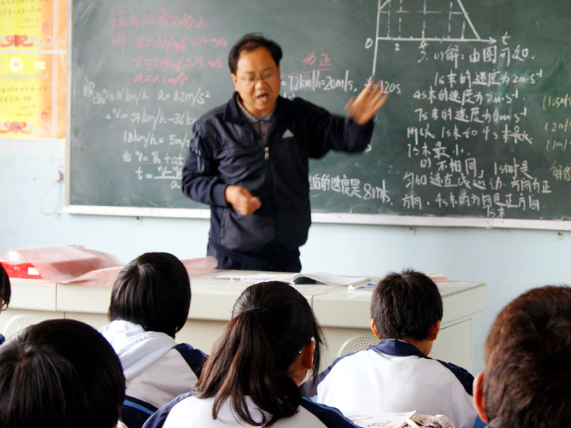 这是我们的物理老师。大家很喜欢他。他很严厉,可是上课却是很认真,除了一大黑板的板书外,还有几十张幻灯片的内容。一节课下来,我们学的东西真是好多啊!