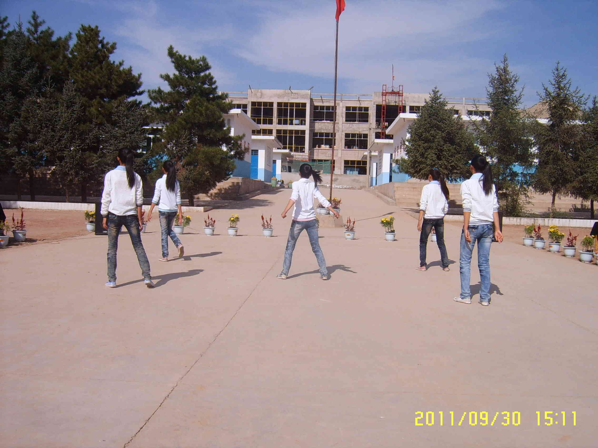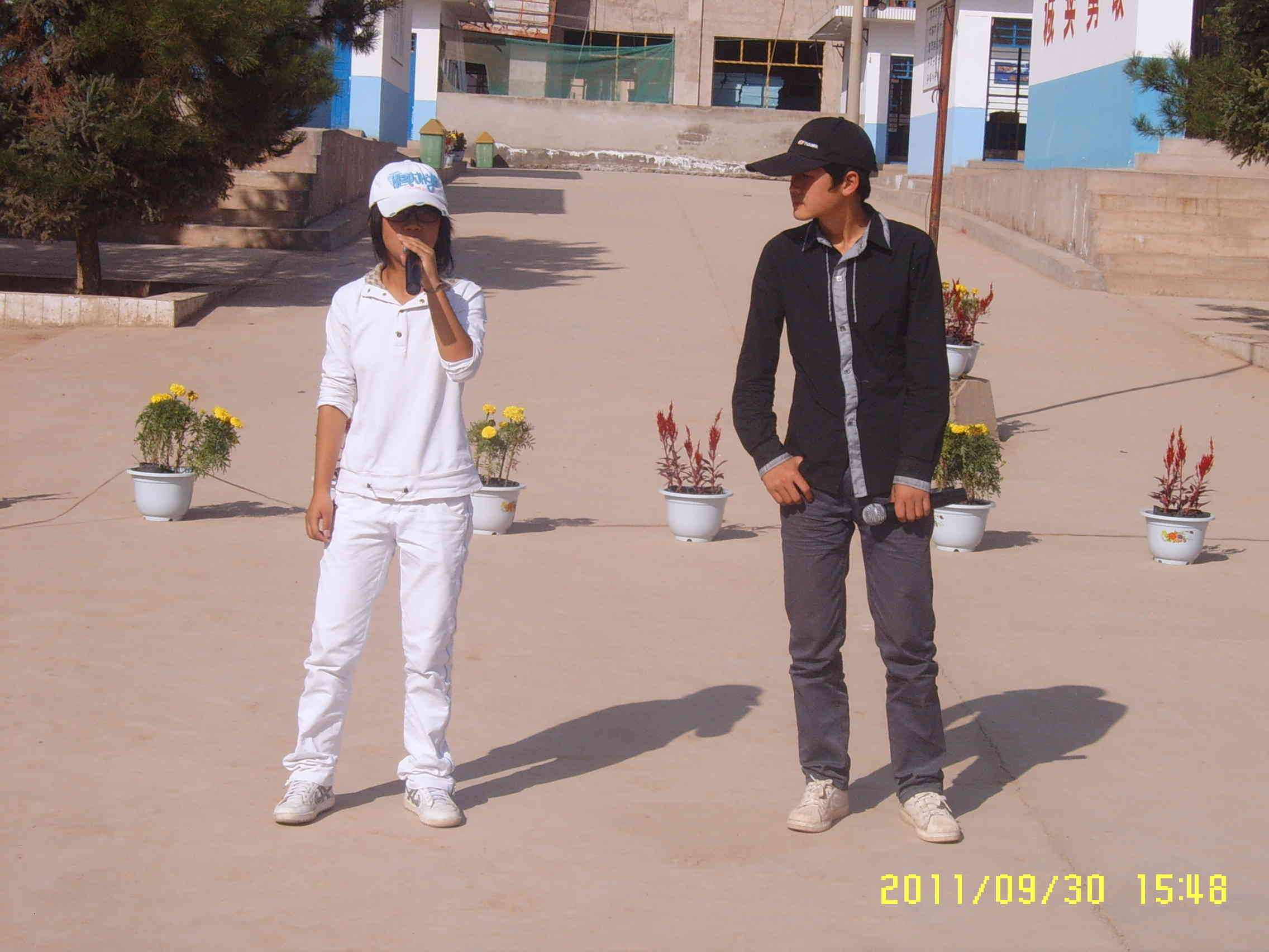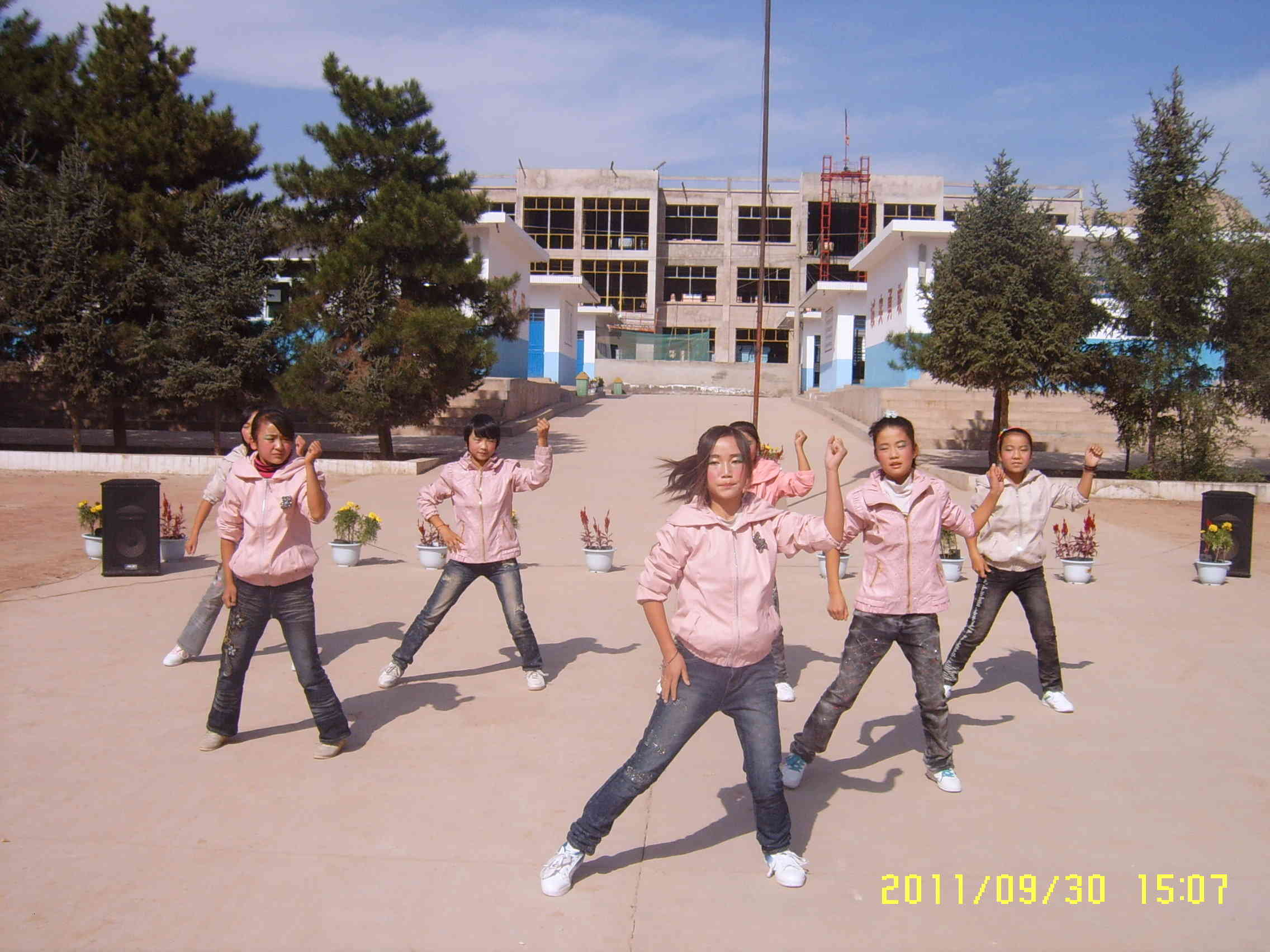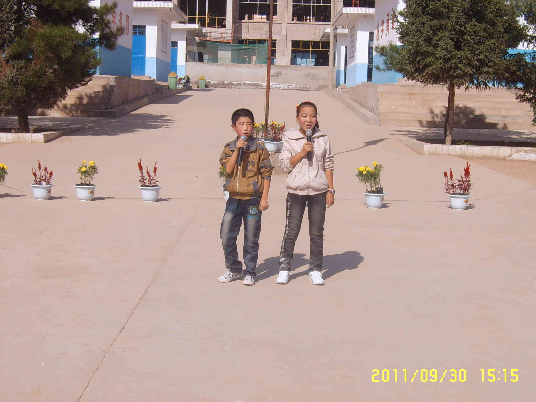 由于学校没有主席台,我们就在硬化的水泥路上表演,由于这次时间比较紧,所以我们的节目只排练了一周的时间,大家利用中午和下午放学的时间在学校里面练习,有些同学还从家里拿来了VCD机。