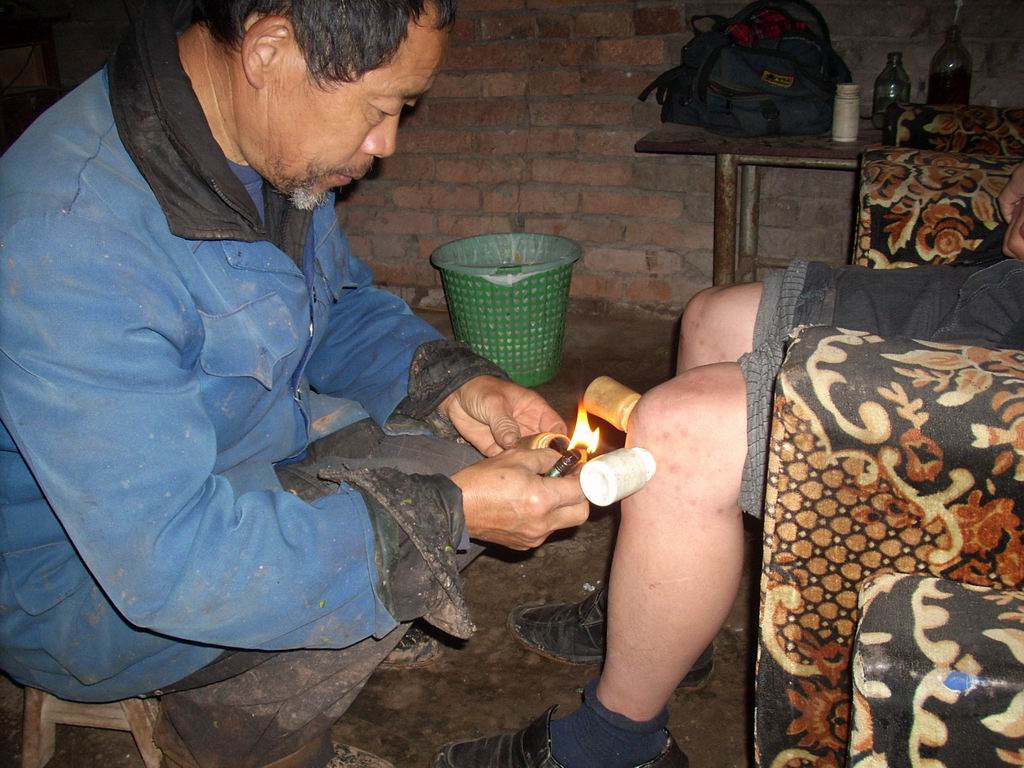 爷爷治病的时候,首先是看一下病人的脸色怎么样,再听一下病人的声音有没有精神,之后就问一下病人哪里不舒服,怎么个不舒服法,这样就完成诊断了。接下来就是扎针了,他先找到相应的穴位,再进行酒精消毒,之后用针扎,扎进穴位里,到了一定深度,再转动。时间到了后再进行拔火罐,过十五分钟左右就算完成一次治疗。爷爷的这种治疗比较方便简单,收费也很便宜,他说:"我主要是为大家服务。"