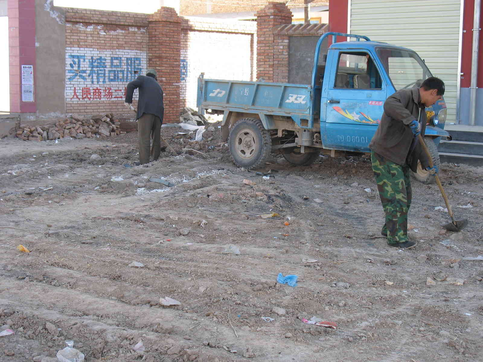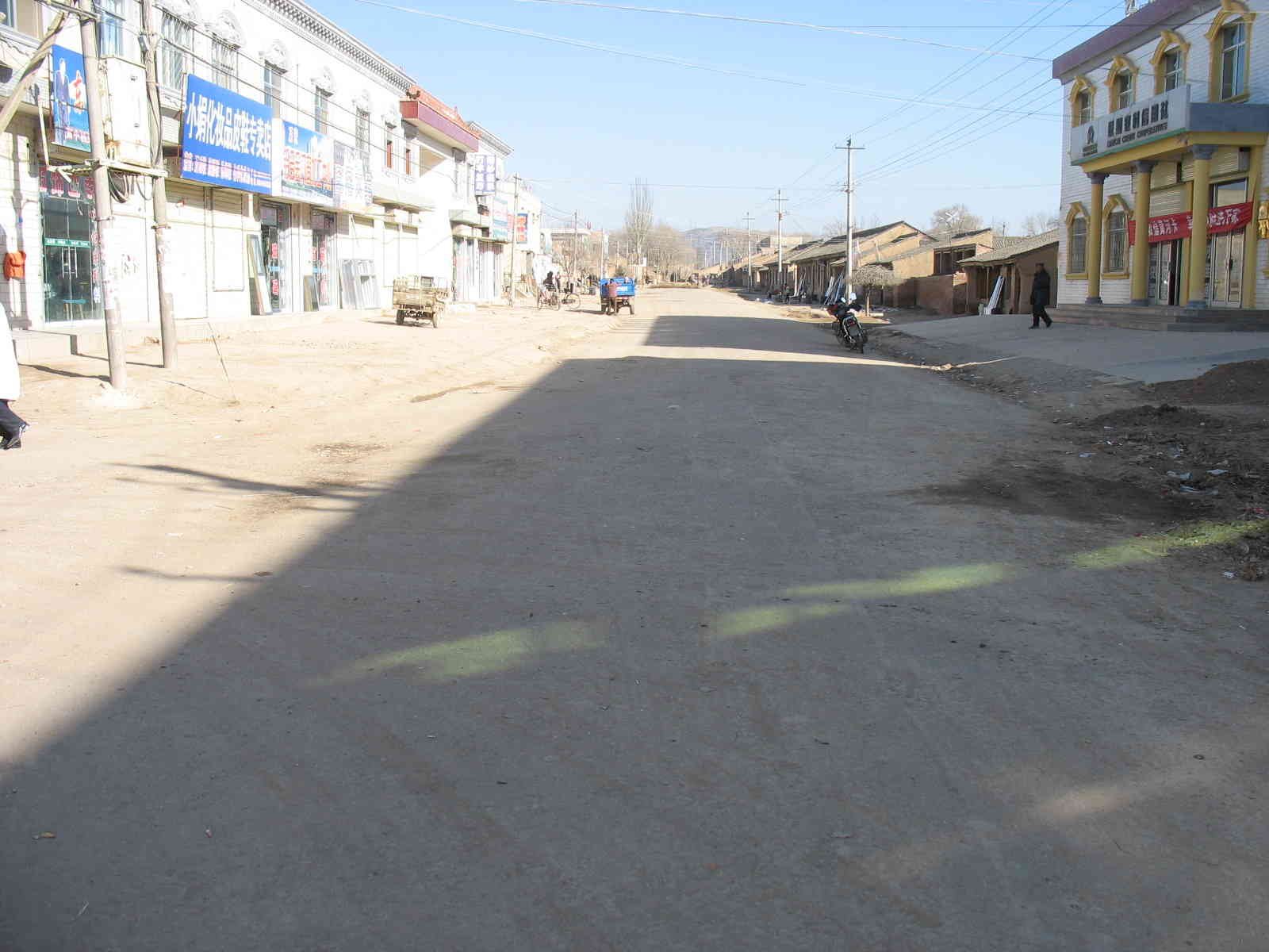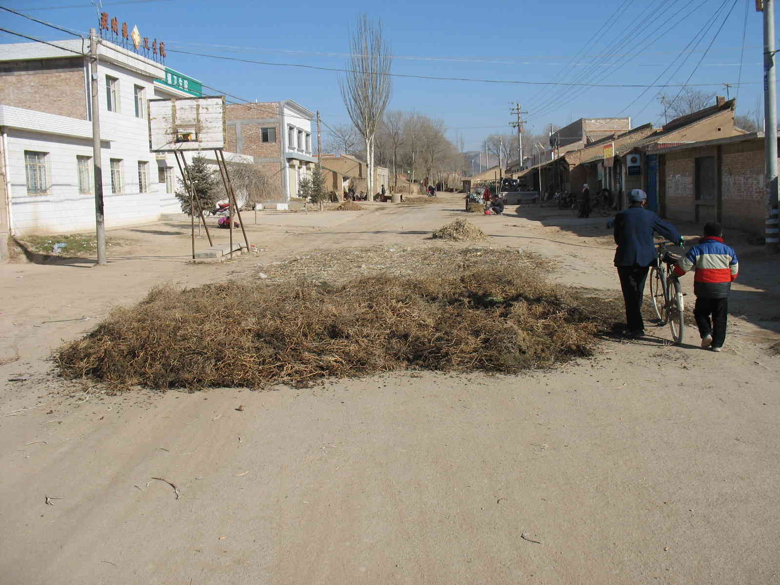 太冷了,太阳的光也不像夏日那样强烈了。如果稍有一点阳光,人们就将秋收放在属下的洋芋蔓,辣椒树,菜根,操等铺开晒在街道上,因为每天来往的车辆很多,柴草在车辆的重压下很快会被压平,平摊在地面上,这样一来柴草很容易干,干后又被人们用架子车拉回家烧炕。柴干后土就落在街道上,给街道铺上一层"棉袄"。