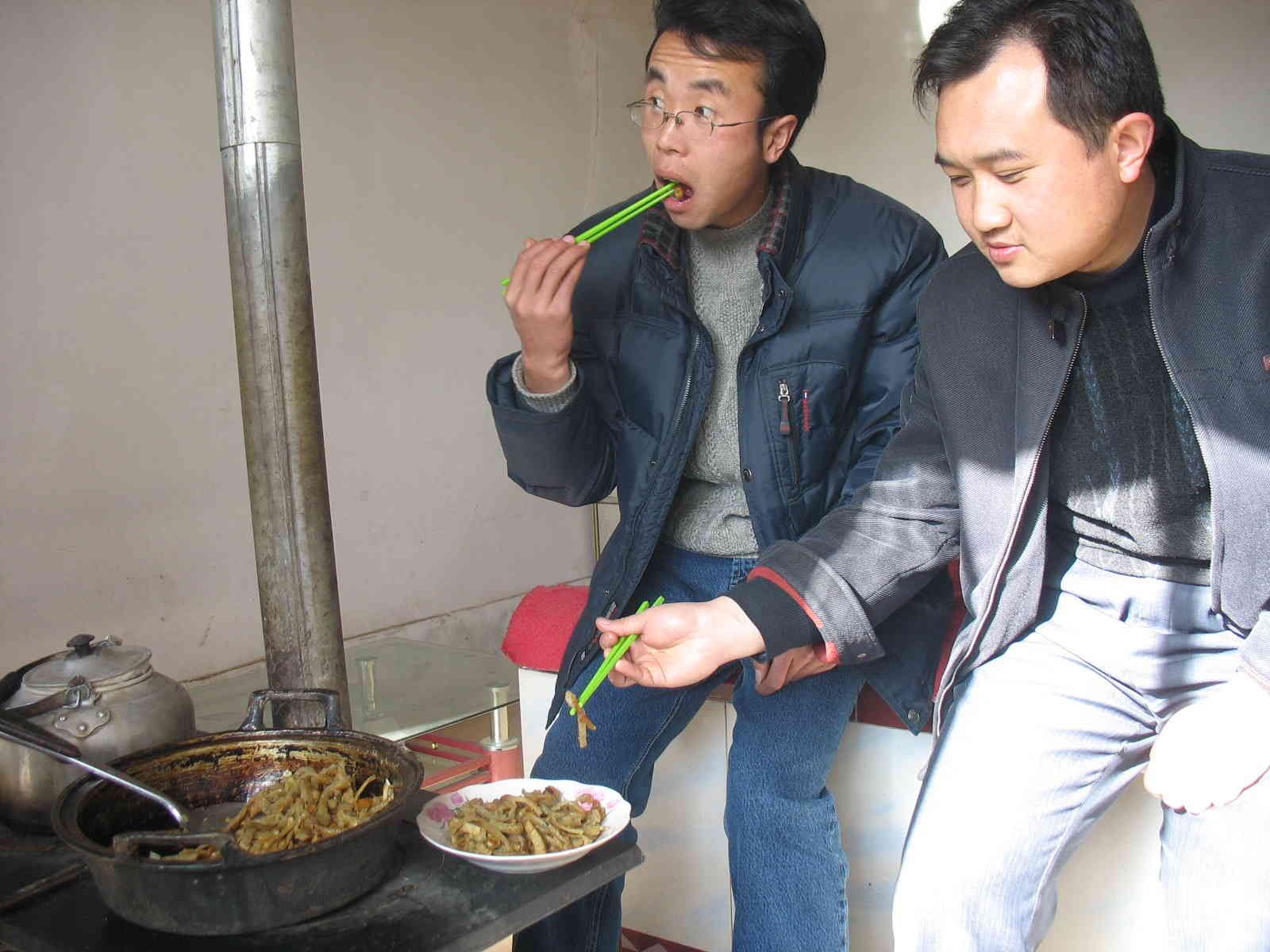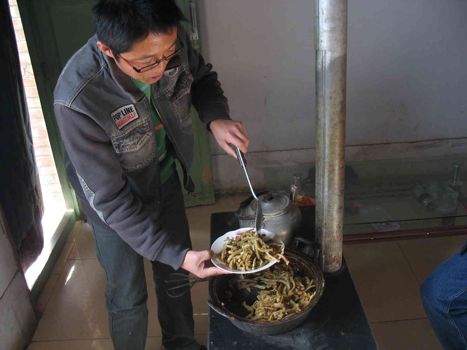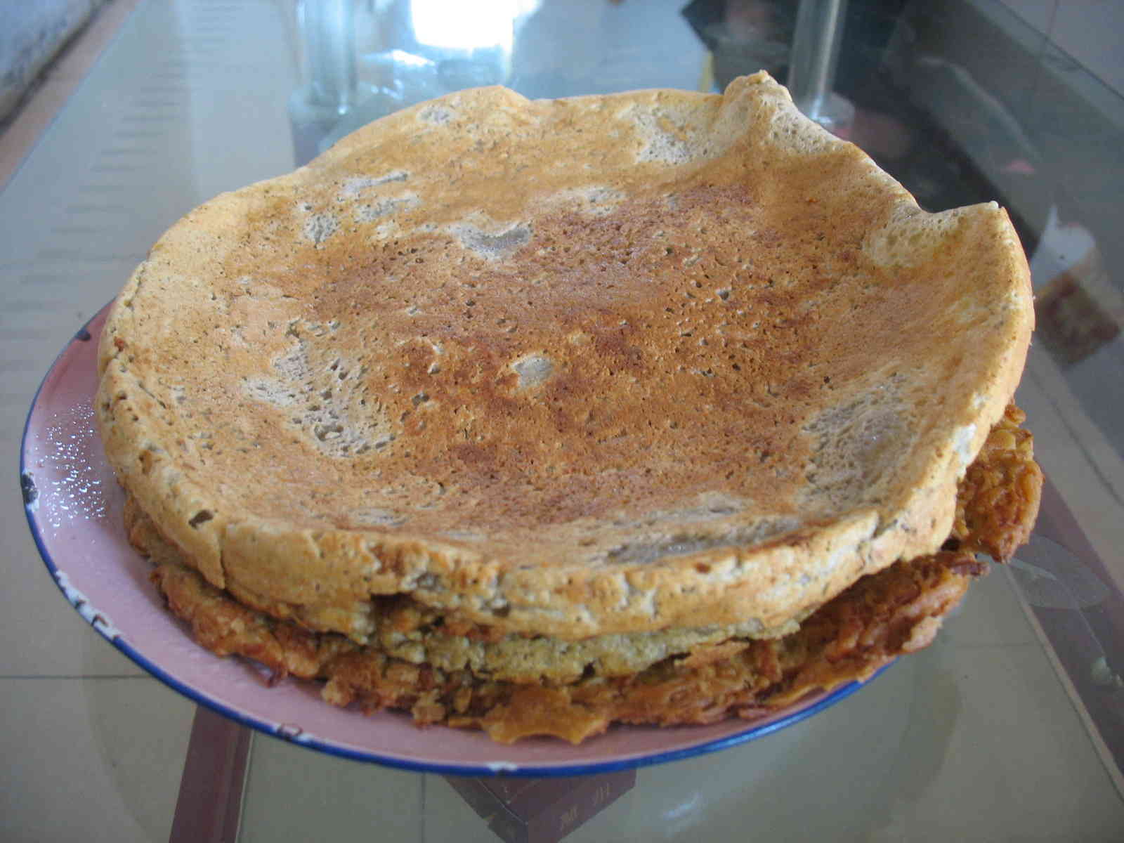 入锅前,在热锅中适量的倒入一些油,待油热后将它们抹在锅底。两三分钟后给它做个翻身运动,等到另一面也熟后,可口的摊馍馍就可以出锅了,噢差点忘了关键的烙摊馍馍时要用中火。出锅后的摊馍馍可以直接吃,当然也可将它切成块状和别的菜炒一下,那可真是色、香味俱全了。