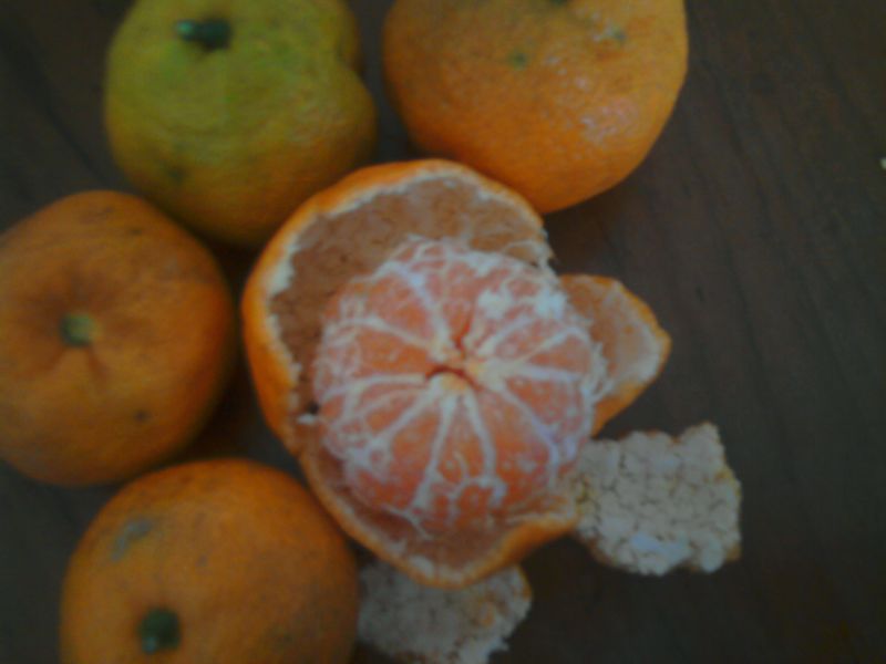 这些橘子都是他们自己辛辛苦苦种的,连地都是十几亩,因此才用了车拉,这些橘子是我很喜欢吃的东西。在农村里的食物,都是很有营养,又没有大量农药的,让人吃了觉得心旷神怡,自在。在橘子的叶子上,有一些小虫子,那便是能够表现出橘子没有农药的最明显的证明了。