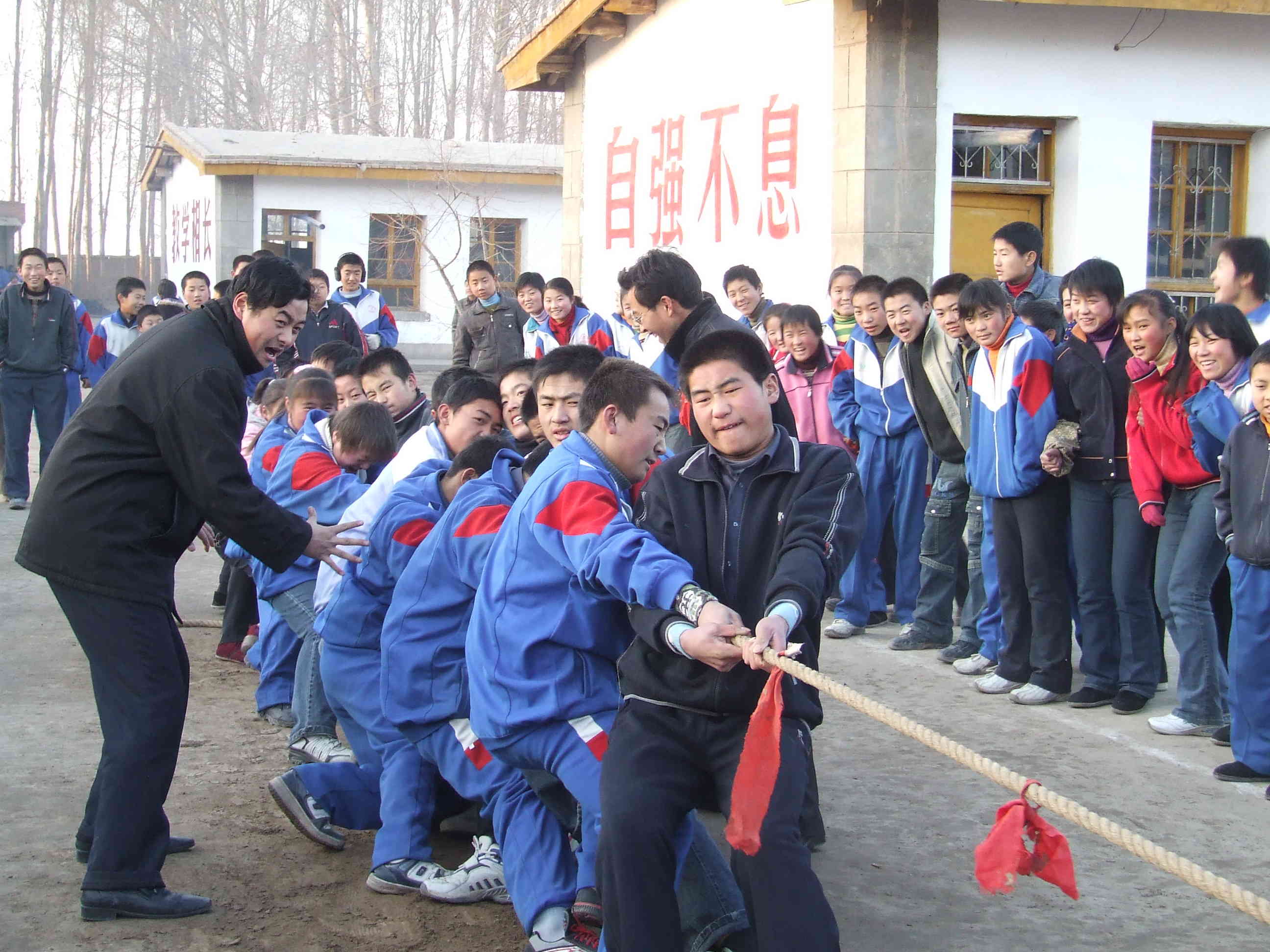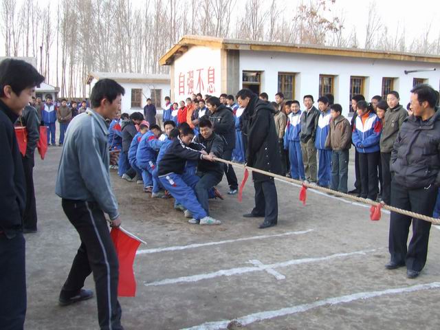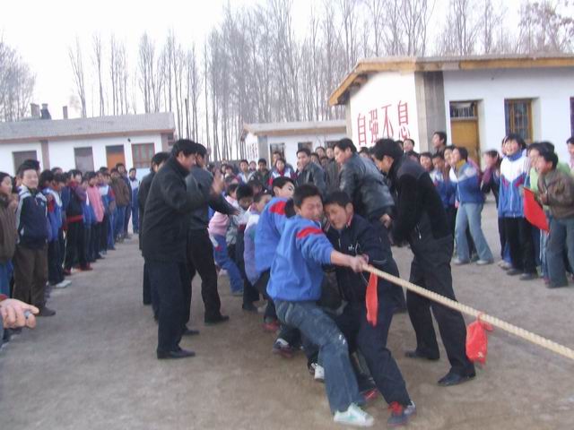 参战的勇士们 再看已经准备好拔河的勇士们:双手紧握着绳子,身体向后微倾,准备在即将开始的战斗中为自己的班集体贡献出自己全部的力量。随着裁判一声令下,激动人心的拔河比赛开始了。只见,他们咬紧了牙关,使出吃奶的劲,在追求最后的成功。旁边各班的拉拉队也不示弱,呐喊助威声一阵高过一阵,都希望最后的胜利能够属于他们。
