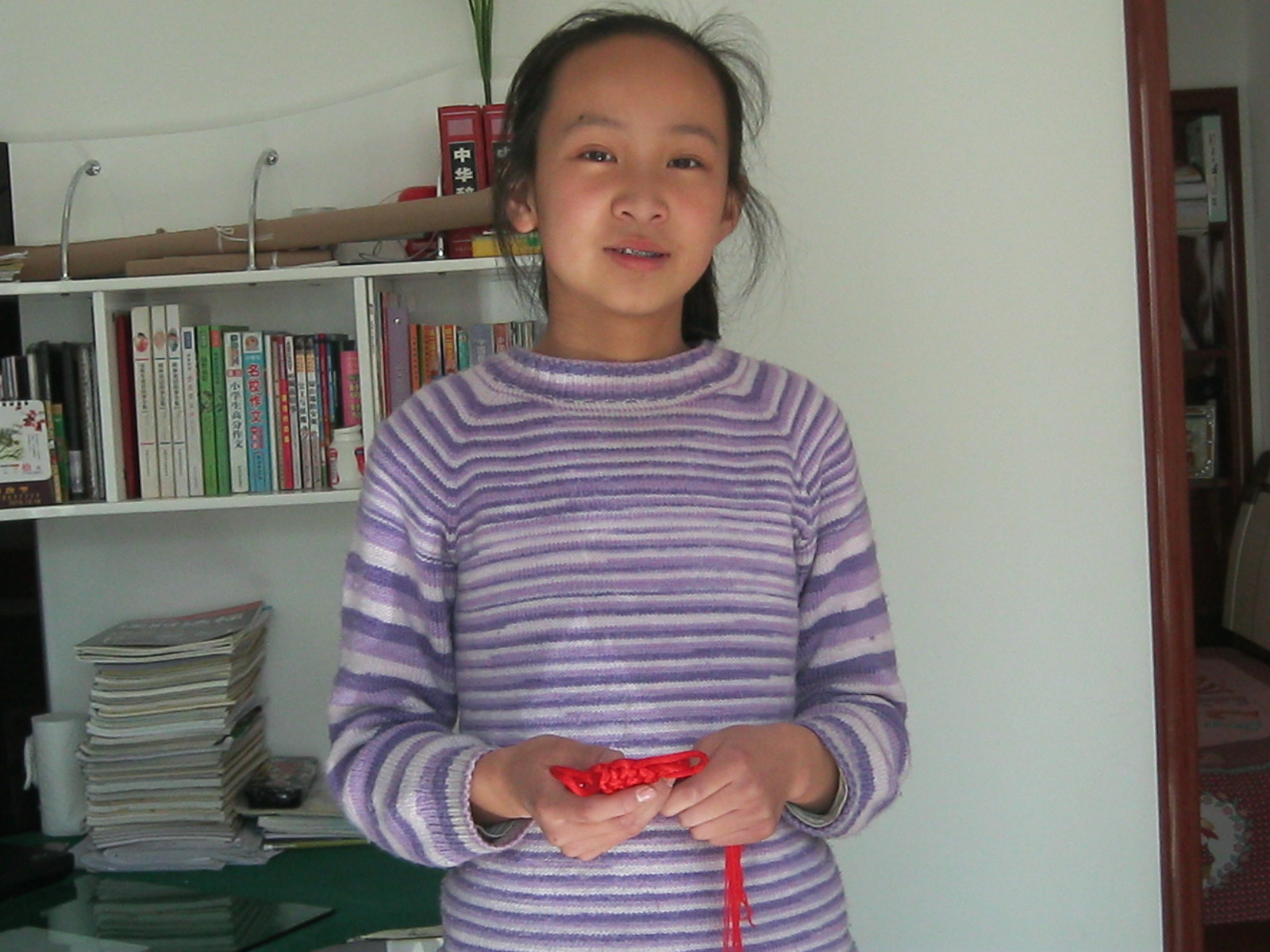 经我俩合作编成的这个中国结,被我挂在了书架上,每每看见它时,一股小小的自豪感就会在我的心里油然而生。同时附带的,还有那份纯真的快乐。