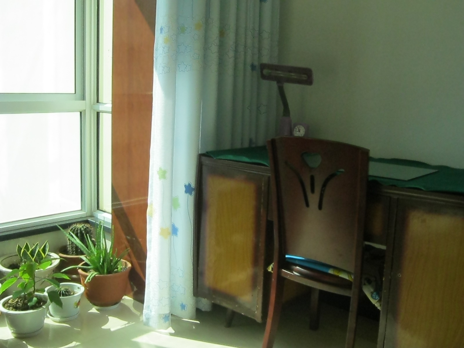 书桌旁边,还放置了一个写字台。上面同样铺着墨绿的毯子,天气好的时候,我就会在这儿写作业。阳光透过大大的落地窗照进来,暖暖的,学习起来更有劲儿了。