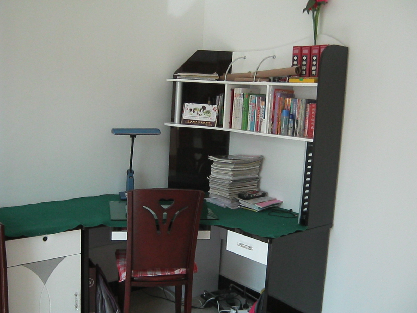 透过45°角的阳光,首先映入眼帘的是一个连着书架的咖啡色桌子。桌面上铺着墨绿的毯子,一个蓝色的台灯,静静地立在那里。书架是白色的,上面摆满了书,莎士比亚说过:"书籍是全世界的营养品。"一有空,我就坐在书桌前,如饥似渴地享受这些美味的东西。