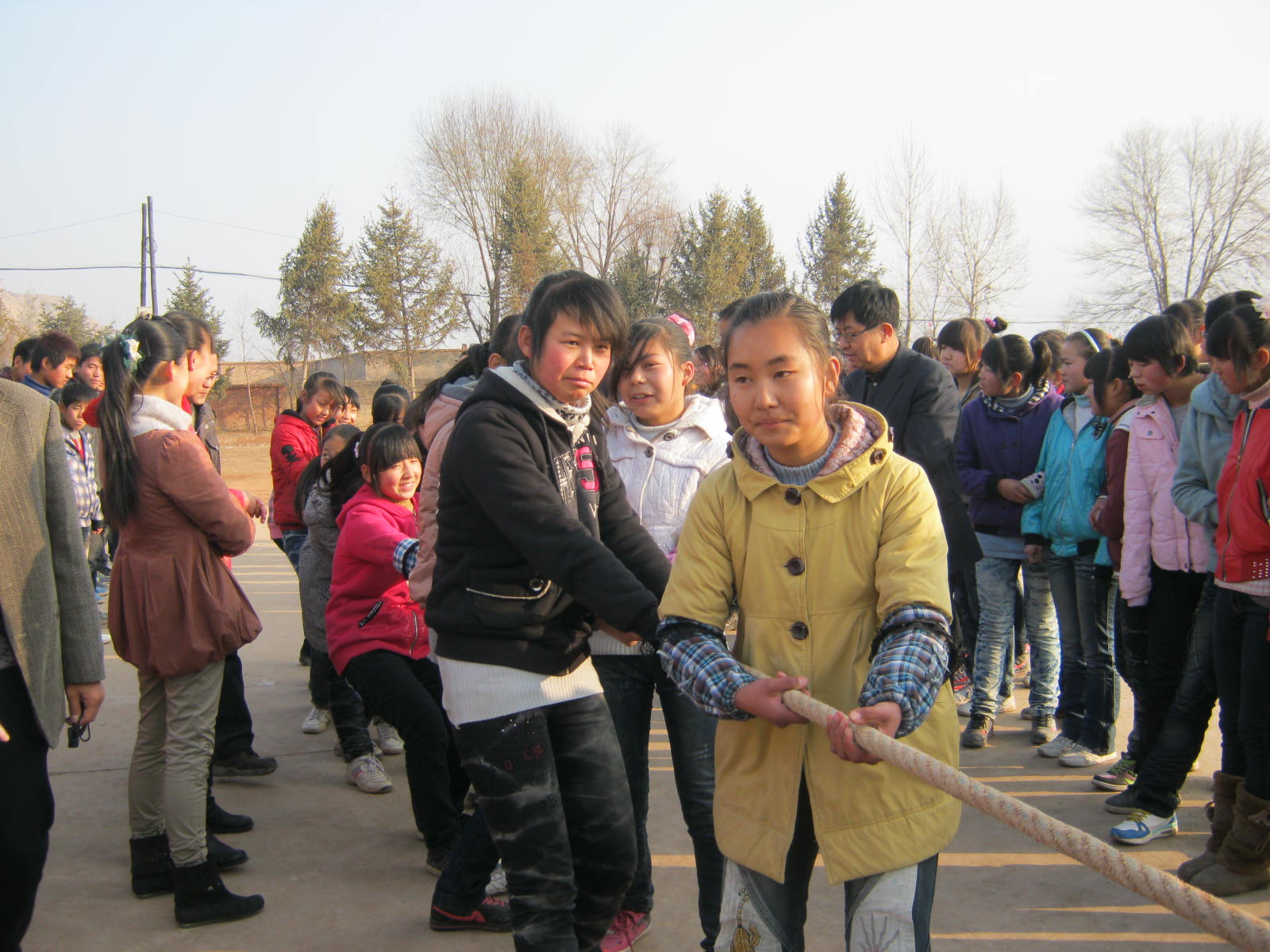 今天我们学校进行了拔河比赛,老师一通知我们大家都跃跃欲试,可是每个班只有十五位同学能参加比赛,我由于身材弱小,班主任就让我当啦啦队员!