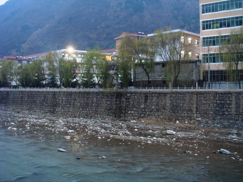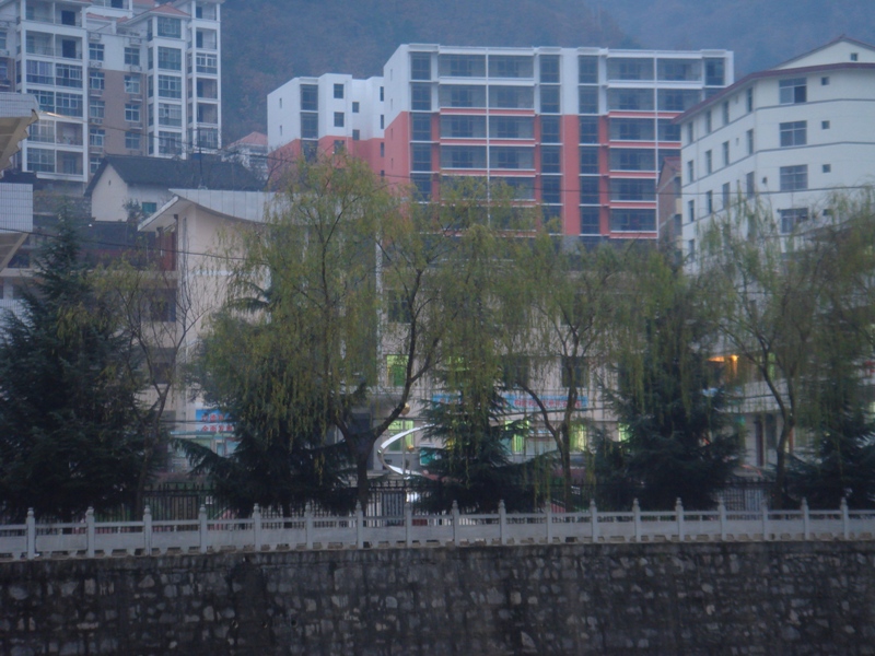 河堤的杨柳迎着风儿翩翩起舞,透过一排排的杨柳看到的学校有一种飘渺朦胧的美感。