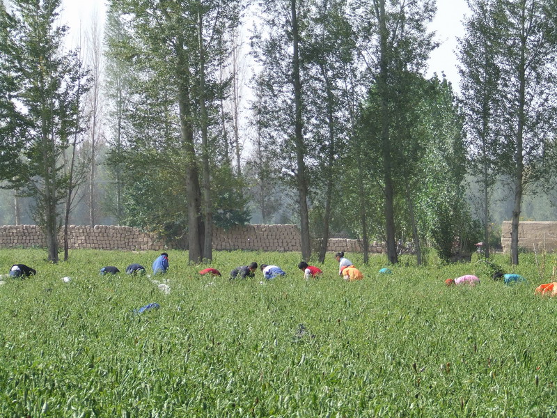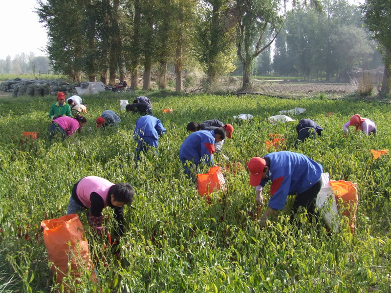 我们这儿种植的主要是小麦、玉米,经济作物一般很少。今年不知怎么的,大多数人家都种上了红辣椒,长势还不错呢!可是辣椒是种好了,如何收倒成了问题。由于大面积的种植了美国红辣椒,成熟的辣椒又不等人,再加上天气也不太好,主要是害怕霜冻(被冻过的辣椒是没人要的,就是喂猪也不吃),种植了辣椒的农户很着急。为了广大农户不受损失,政府出面进行协调,决定让学生出校支农。