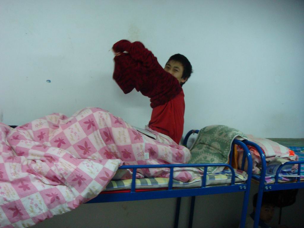 看!多么舒适的环境,多么整洁的床铺。不错吧,我们可是全级的优秀宿舍呀!