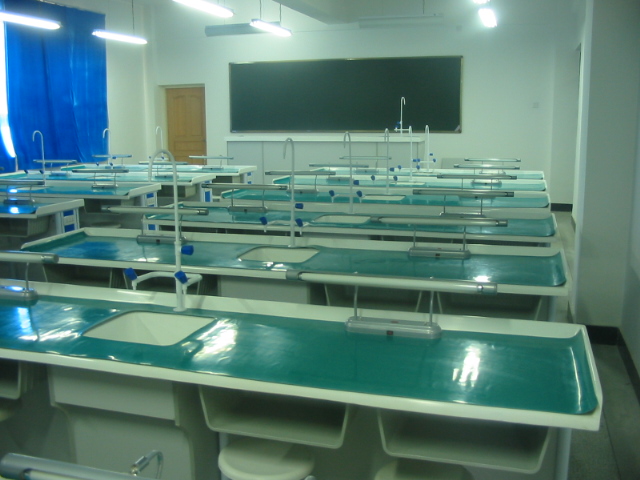 化学实验室的正前方有一张主实验台,是老师授课用的,整齐的实验台美观实用,而且每张桌子配了可旋转的椅子,每张实验桌上都有试管架.