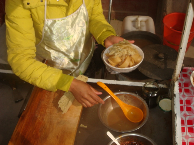 武威人卖面皮子不开店,只在街边小推车上搭一个玻璃罩,面皮子摞在里面,当有人来时,买面皮子的人便从里面取出一块,抹上清油,利利索索切好,再放上面筋,调上醋卤,热情的端给顾客。面皮子的味道非常美,面筋中吸满了醋卤和辣椒油,嘴里酸酸的,辣辣的,滑滑的,咽下去凉丝丝的,舒服极了。