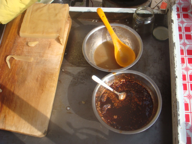 把水盆放好,等水中的面粉沉淀到盆底时,把上面的的水倒掉,然后加入一种特殊的原料——蓬灰水,再把面水放入特质的"蒸笼"里蒸,蒸好后切成块或条,加入佐料就可以吃了。武威人对面皮子里的醋特别讲究,先在醋里放入各种调味品,再把醋煮开勾兑成糊状,然后才食用。武威人把这种醋叫醋卤。这样面皮子就做好了,接下来就是拿去卖了。