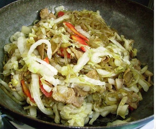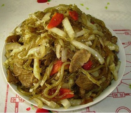 其实它的制作过程非常简单,光从菜名上看,很多人就知道主材料就是酸菜和粉条,不错,主材料就是酸菜和粉条这两样东西。但是如果再加上些洋葱或肉,味道更佳。材料准备好了,其实制作过程跟做平常菜一样。所以我就不再多说。一切忙活完了,一盘美味可口的酸菜粉条就做好了。