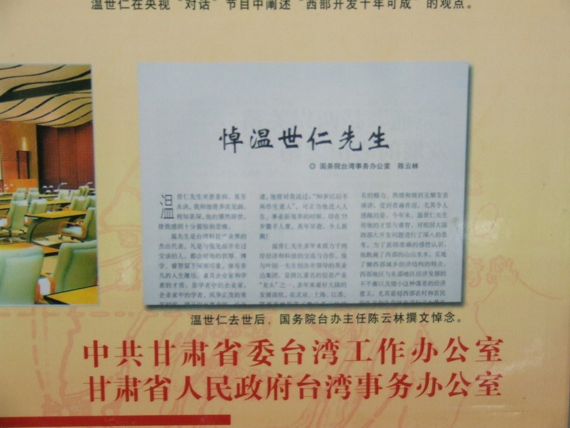 在武威群艺馆参观展出的人很多,解说员在不停的给我们解说着这一幅幅图片的相关内容。当解说员说到温世仁爷爷的名字的时候,我眼前一亮,心中有种如沐春风的感觉。温爷爷是台湾著名的企业家,他开发西部的决心,对西部贫穷儿童的大力资助,使我更加深刻的感受到温爷爷那份浓浓的中华情。