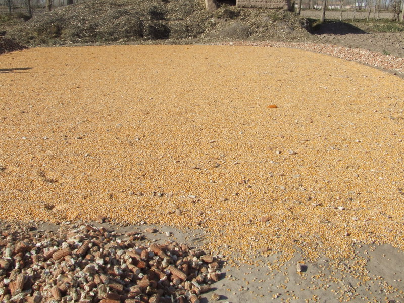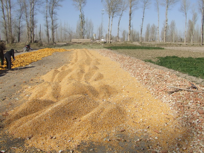 接下来,我们将玉米 堆放到打麦场的四周,把玉米籽在打麦场上摊开,摊匀,好让它们干得快一些。