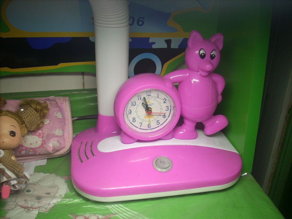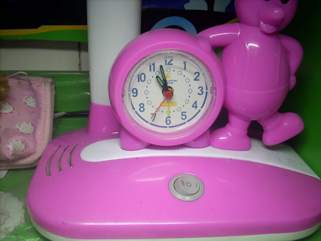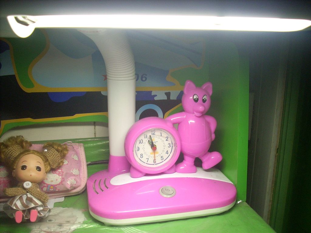 灯座上有一个圆形的小闹钟,其直径约7厘米,而且时间走得很准。闹钟旁倚靠着一只可爱的小熊。它撑着腰,挺着圆鼓鼓的肚子,似乎在顽皮地对我说:"注意时间,该学习了!"原来单调的台灯加上了动感时尚的闹钟,这样的设计不仅美观,而且有利于掌握学习时间,提高学习效率,真是一举两得啊!