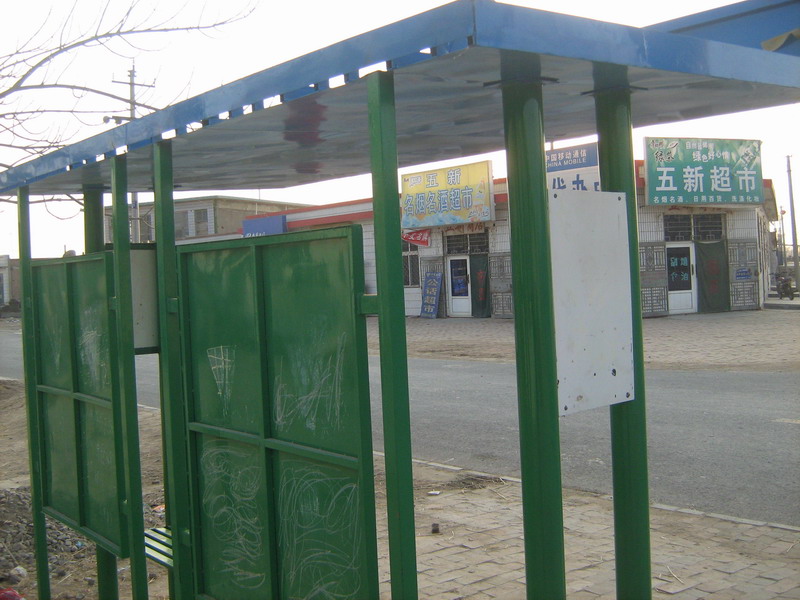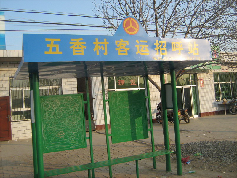 瞧,这是一个我们村上设立的“可用招呼站”。它的构造非常简单,就是用铁铸成一个想听自似的架子,用蓝色的汽喷了,然后固定好,这就是一个简单的招呼站。