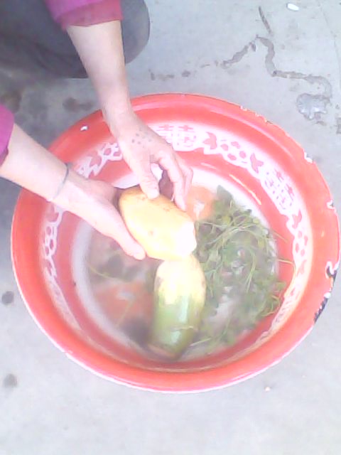 妈妈开始做饭了。第一步是洗菜。妈妈先从袋子中拿出两个萝卜,两个土豆,一把油菜,然后一起放到盆子中洗干净,接着轻轻地放到案板上仔细地切碎,并将每种菜按先后顺序分开。