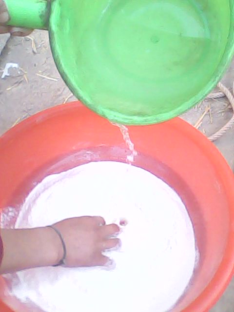 第二步是和面。只见妈妈先挖了两碗面,倒了一碗水,水中还撒了一点盐,然后妈妈一边向面中加水一边用手在面中搅揉,一会儿面就变得光滑了,最后妈妈抹了点香油并装到了一个塑料袋中去。听妈妈说这叫行面,否则会拉不开的。