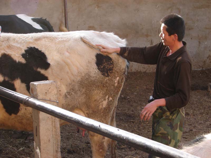 这个养殖场的经营者是一家子,男主人主要负责奶牛的喂养和挤奶工作,女主人则负责销售方面的事务。男主人每次把拌好的饲料盛放到大皮盆里,再端到栏前,然后进入牛栏里,用刷子给他心爱的牛温柔地刷粪渍。轻柔的动作使得牛感到像是主人对他的安抚。男主人说这是他每次喂食时必做的工作,时间充足时还可以跟牛说说话,这样可以和牛进行"心理沟通",在挤奶时会很听话。